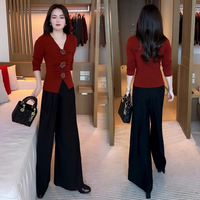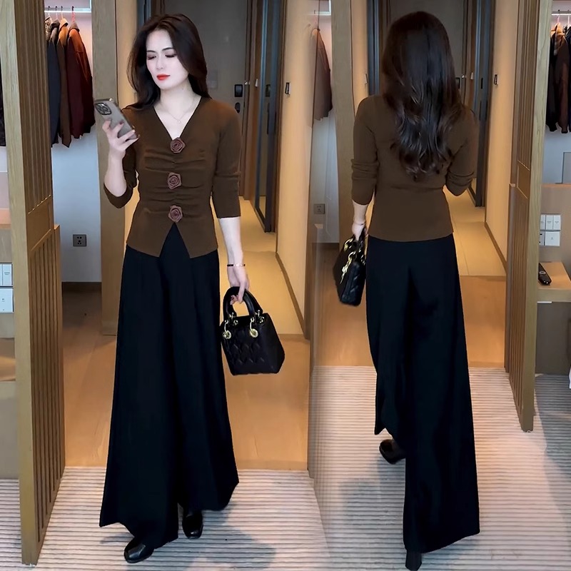 立体花朵打底衫显瘦阔腿裤两件套