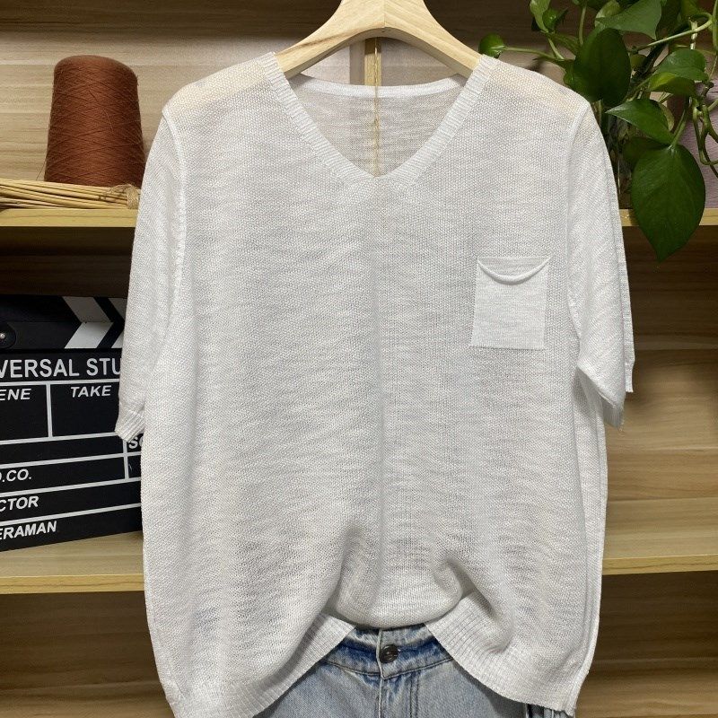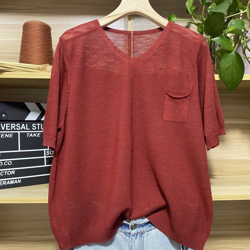 2025新款女装夏季薄款棉麻短袖v领纯色t恤上衣宽松外穿大码针织衫