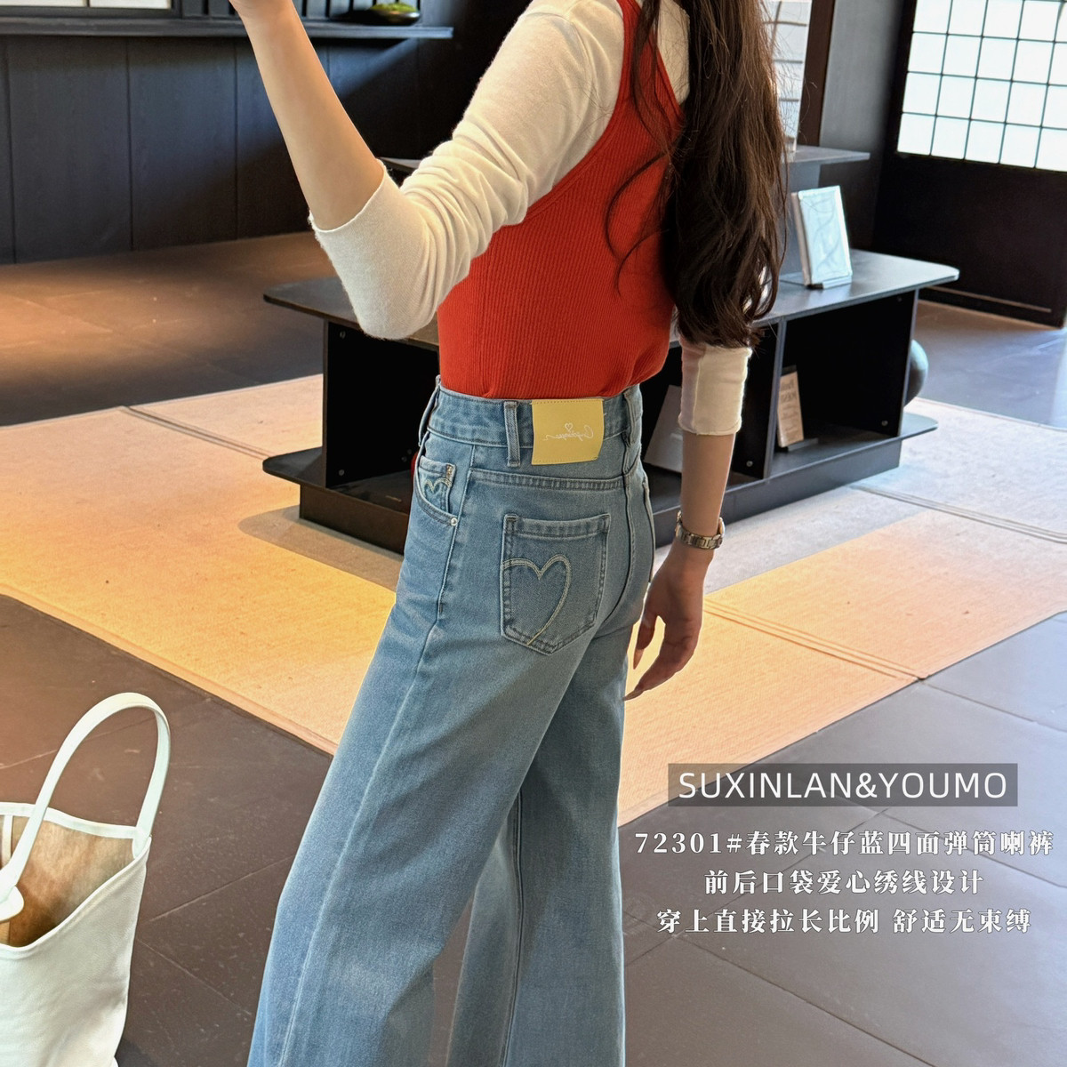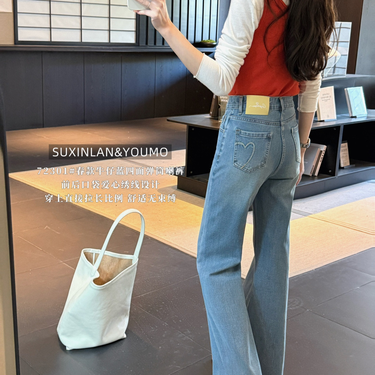 素心兰/YOUMO-气质四面弹百搭筒喇裤爱心印胶设计特色时尚牛仔裤