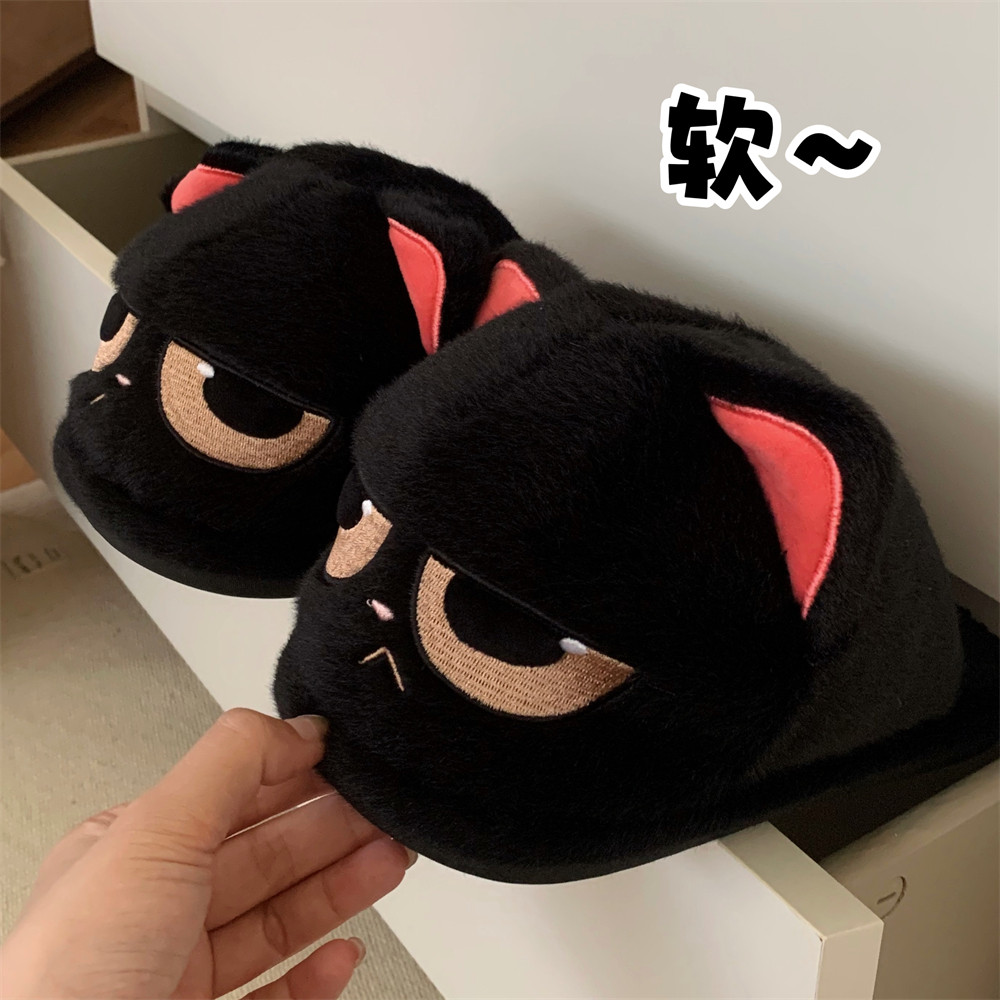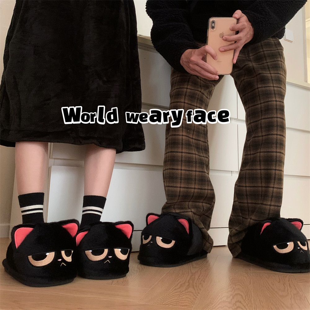 细细条ins生气小黑猫棉拖鞋男女趣味冬季情侣休闲防滑居家毛毛鞋