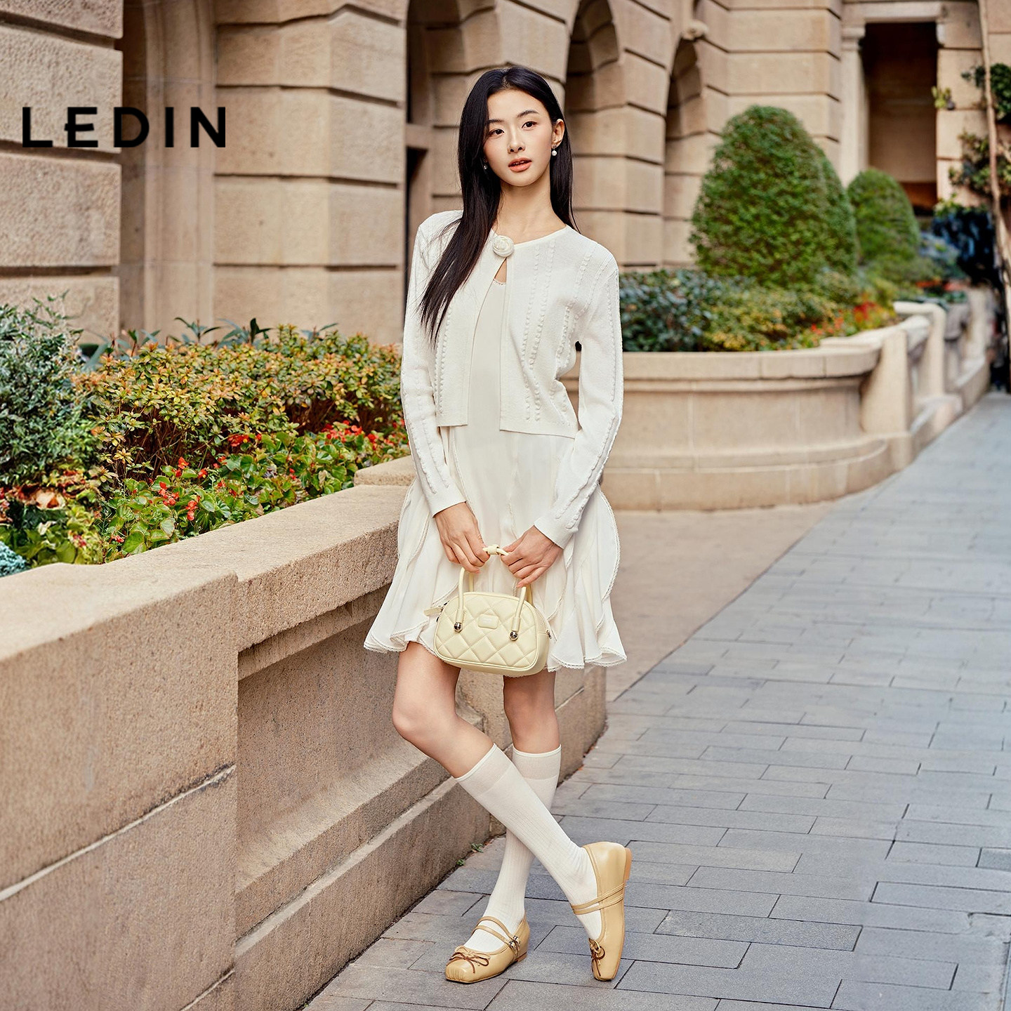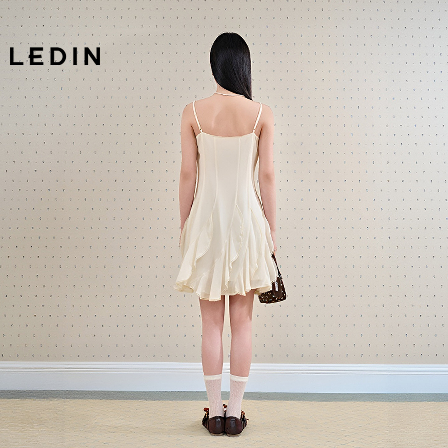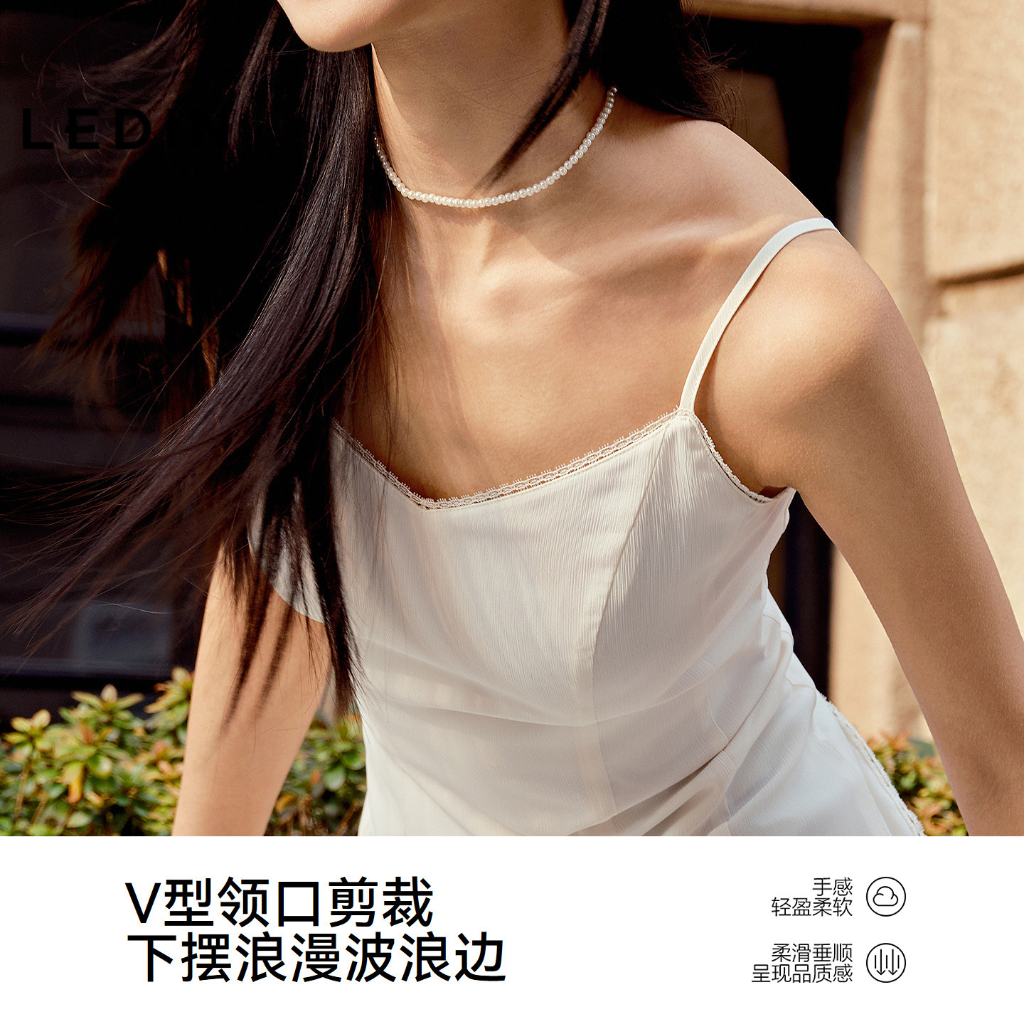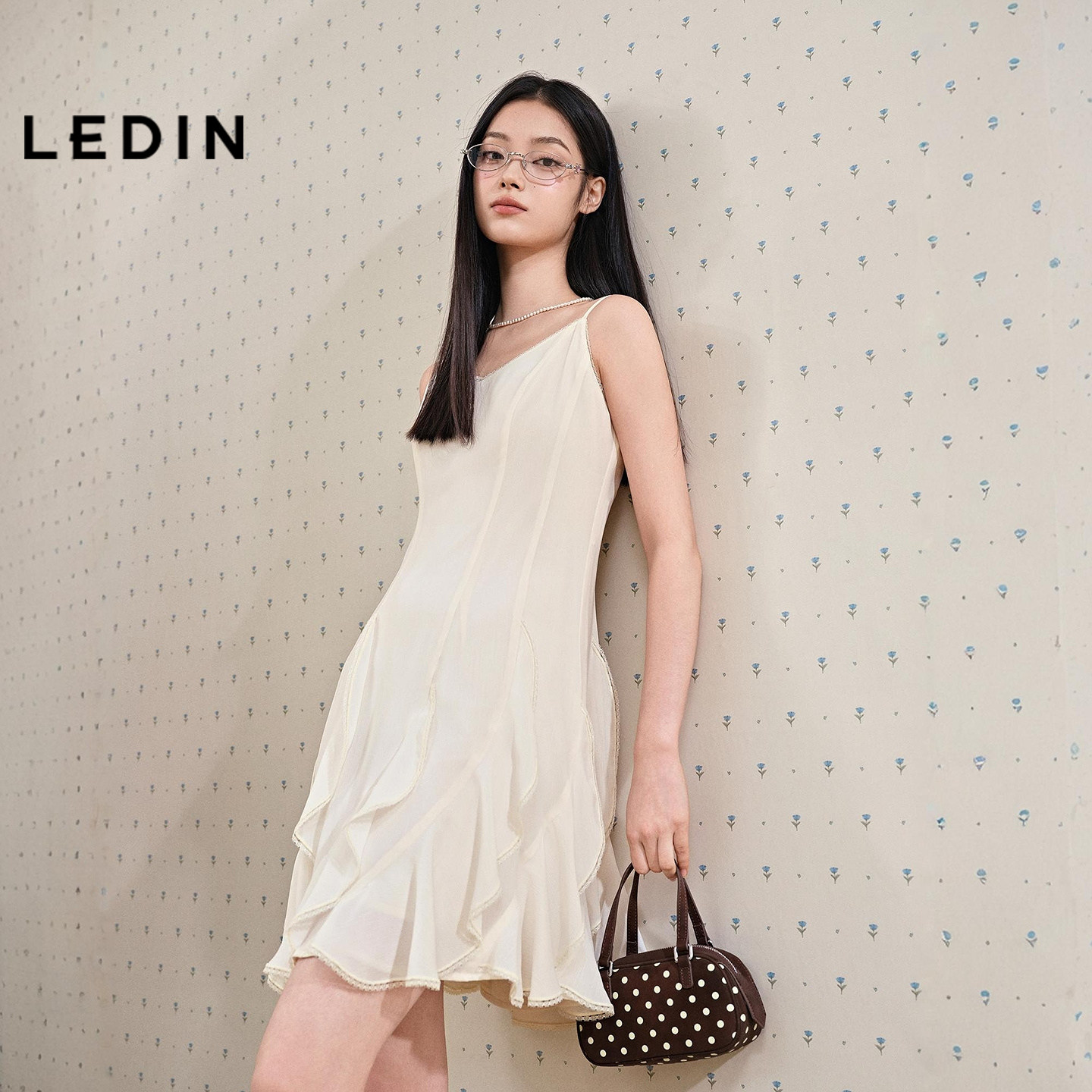 乐町V领吊带连衣裙女装2026年春夏新品下摆浪漫波浪边甜美裙子+
