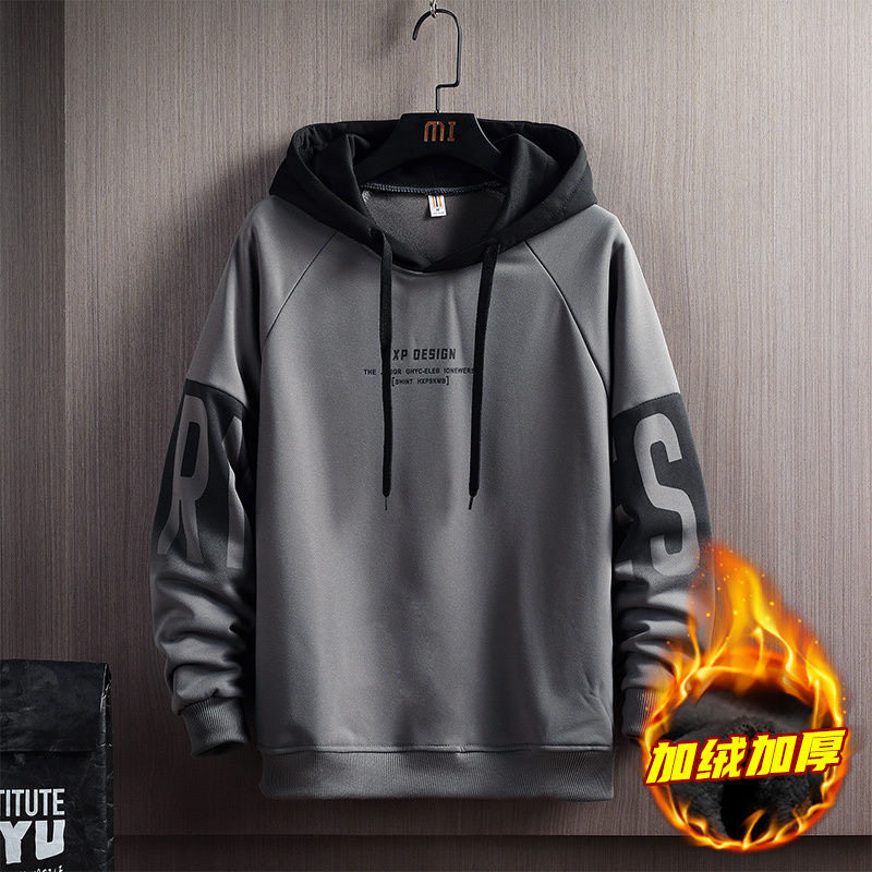 男士加绒加厚连帽卫衣2023秋季新款拼接潮牌秋冬款宽松上衣服外套
