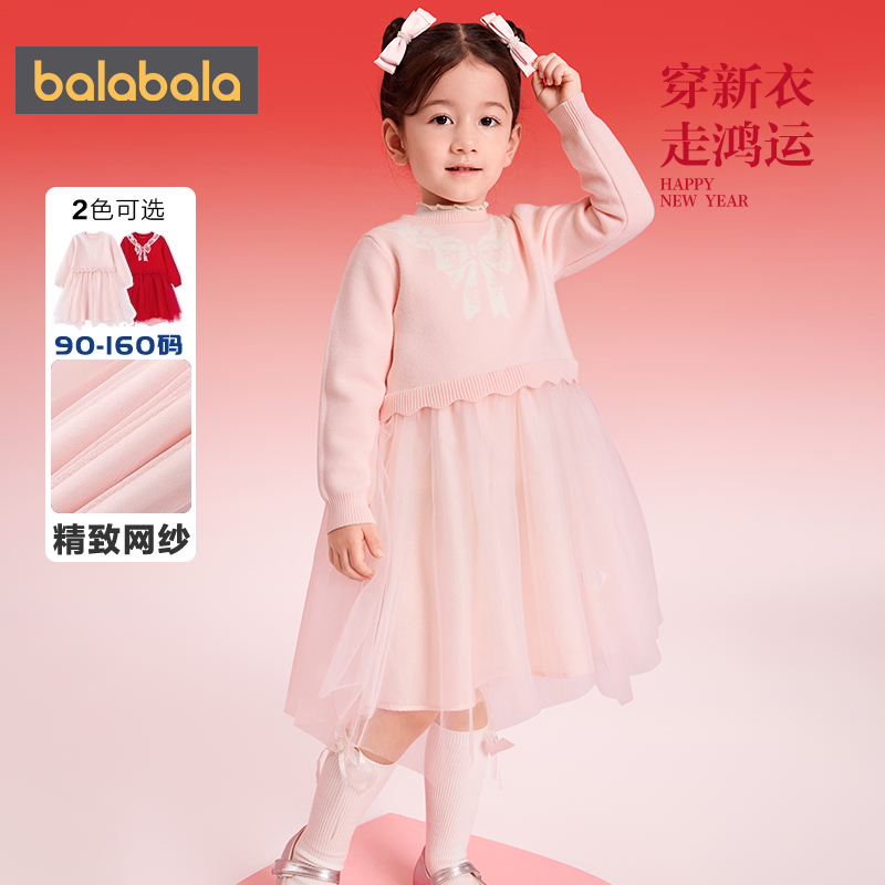 巴拉巴拉女童连衣裙中大童红色拜年服裙子秋冬款童装儿童公主纱裙