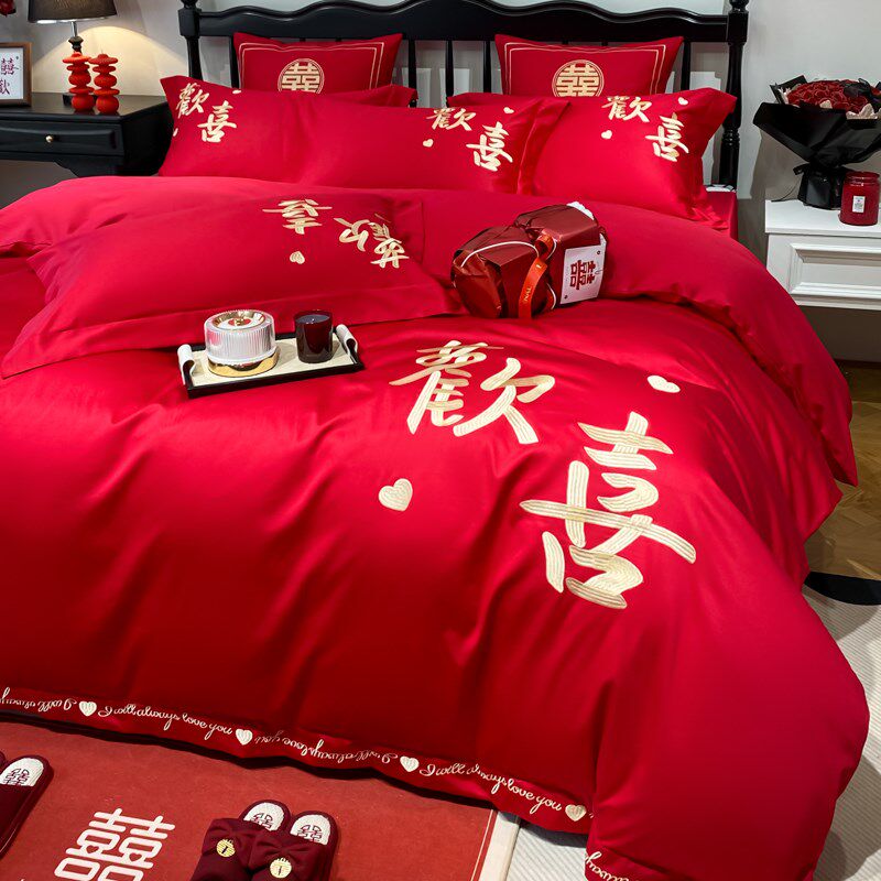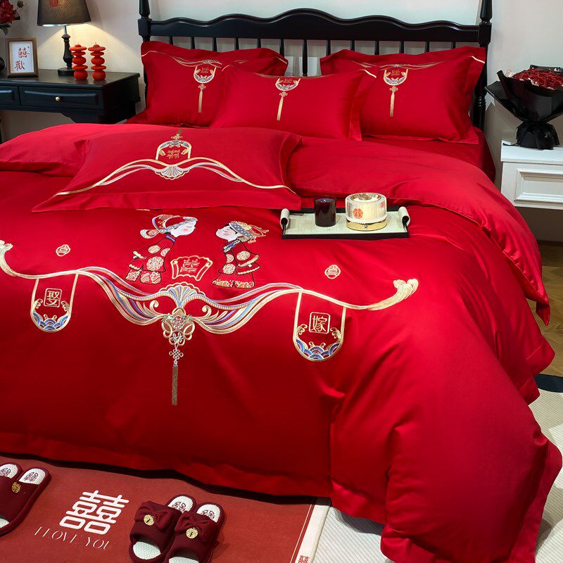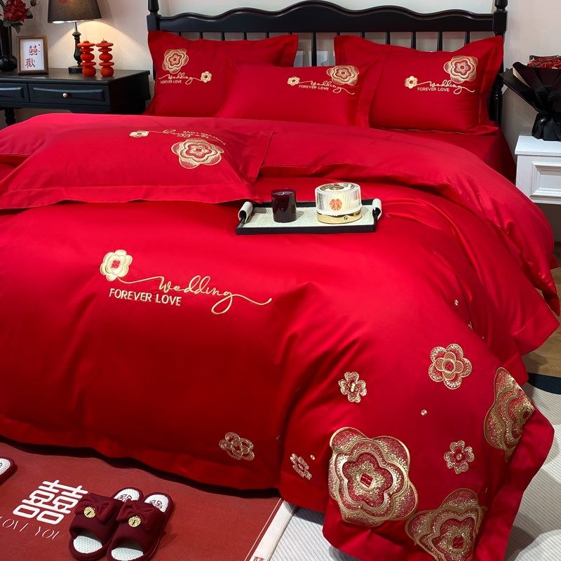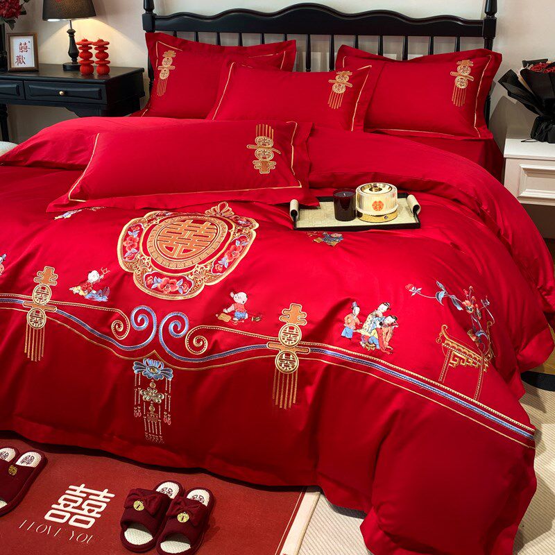 高档结婚纯棉四件套中式婚庆大红色全棉被套床单新婚婚房床上用品