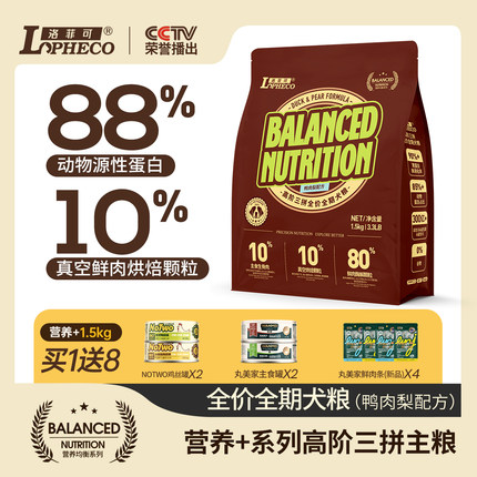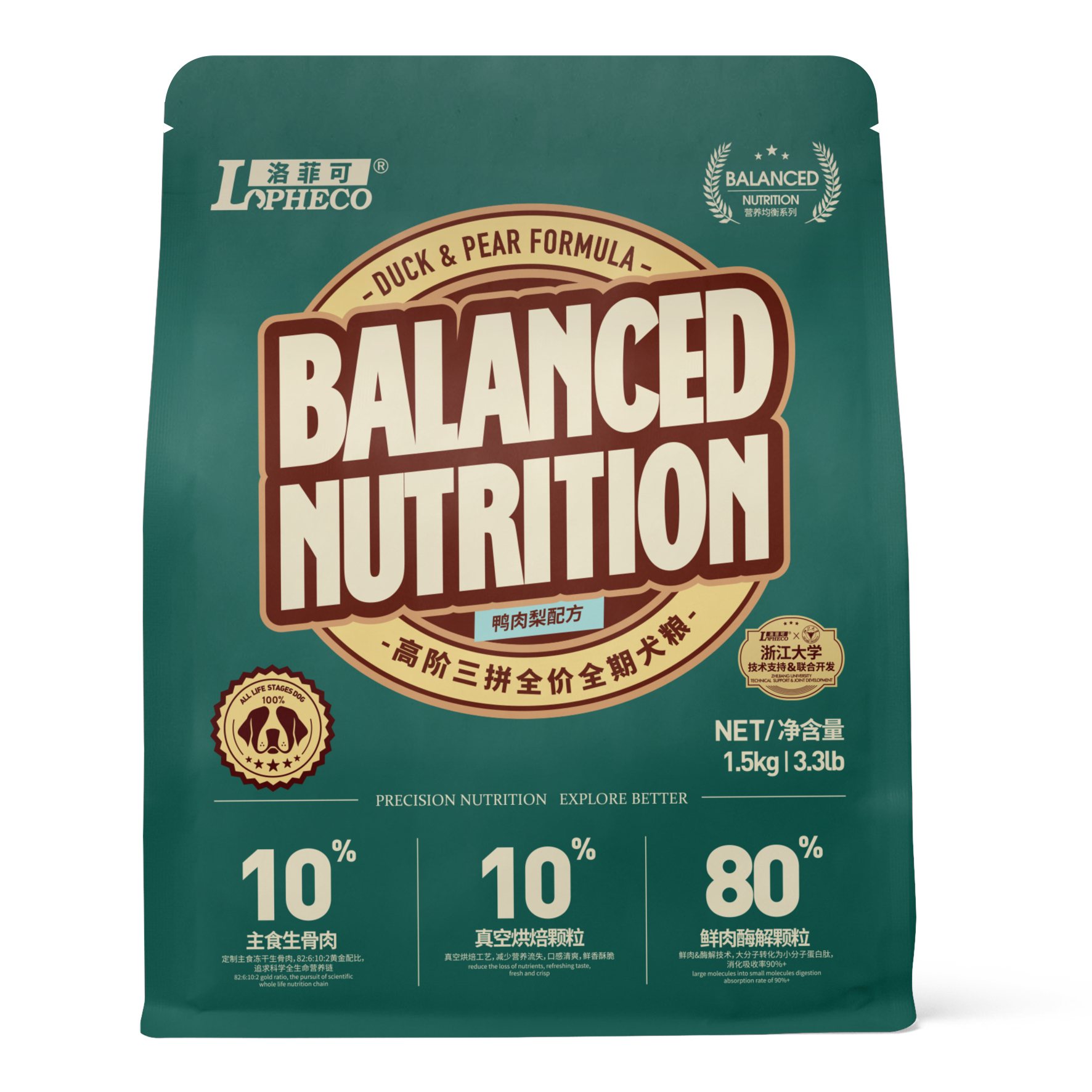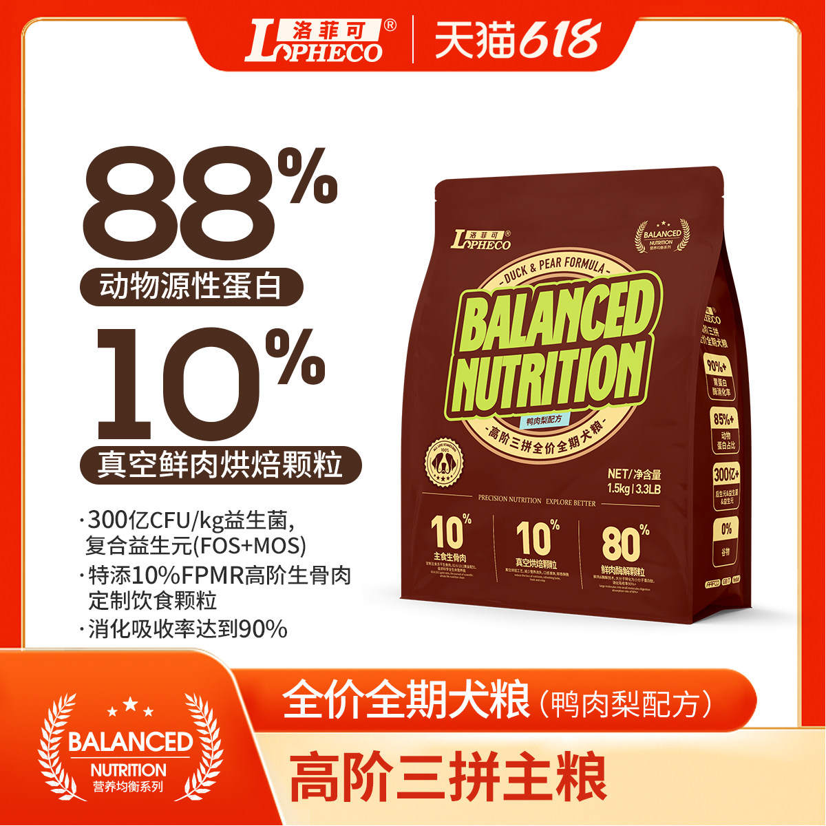 洛菲可营养+均衡系列鸭肉梨犬粮烘焙粮生骨肉冻干三拼粮1.5kg