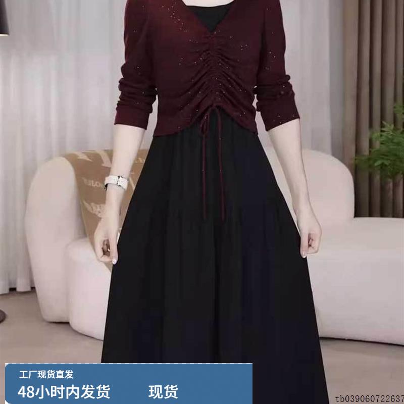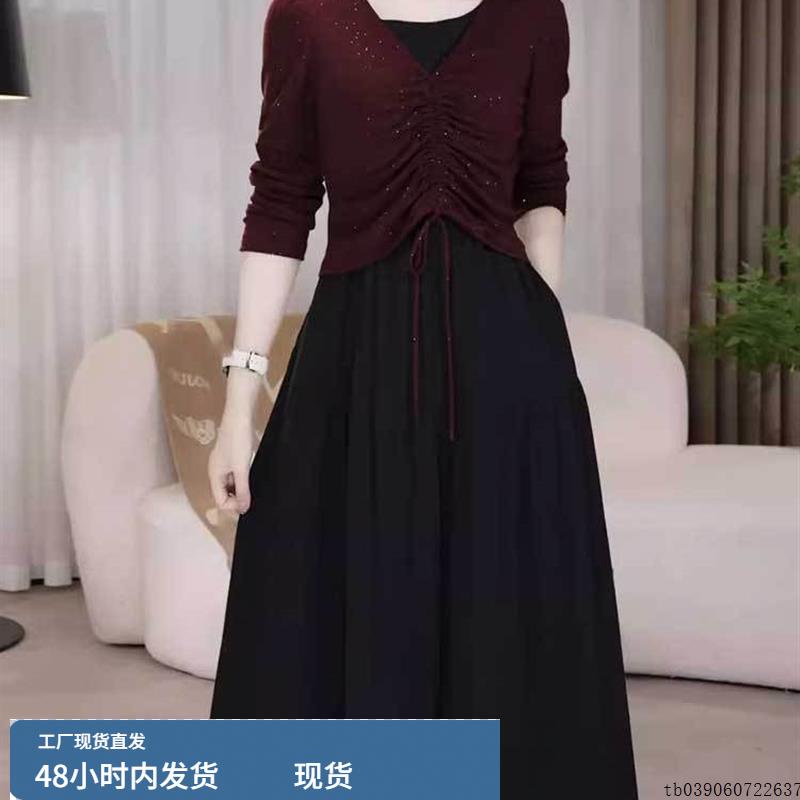 气质优雅假两件抽褶长袖连衣裙秋新款女装中长款气质外穿a字裙子
