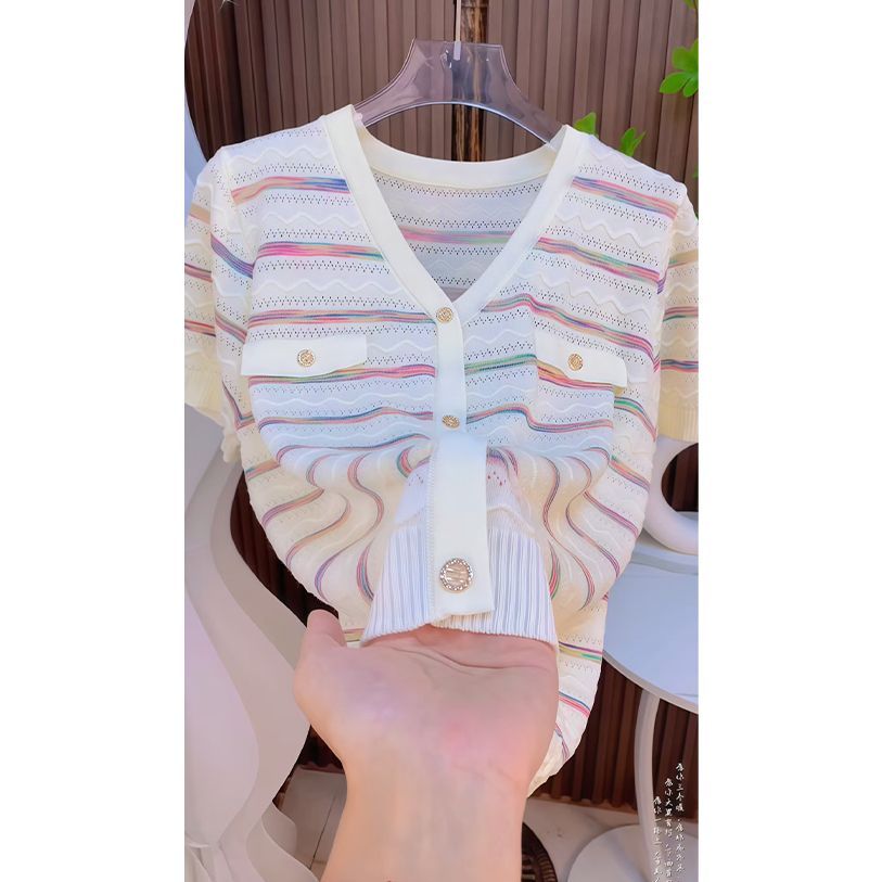 2025新款夏季渐变色法式小香风条纹冰丝针织衫女士V领短袖薄款t恤