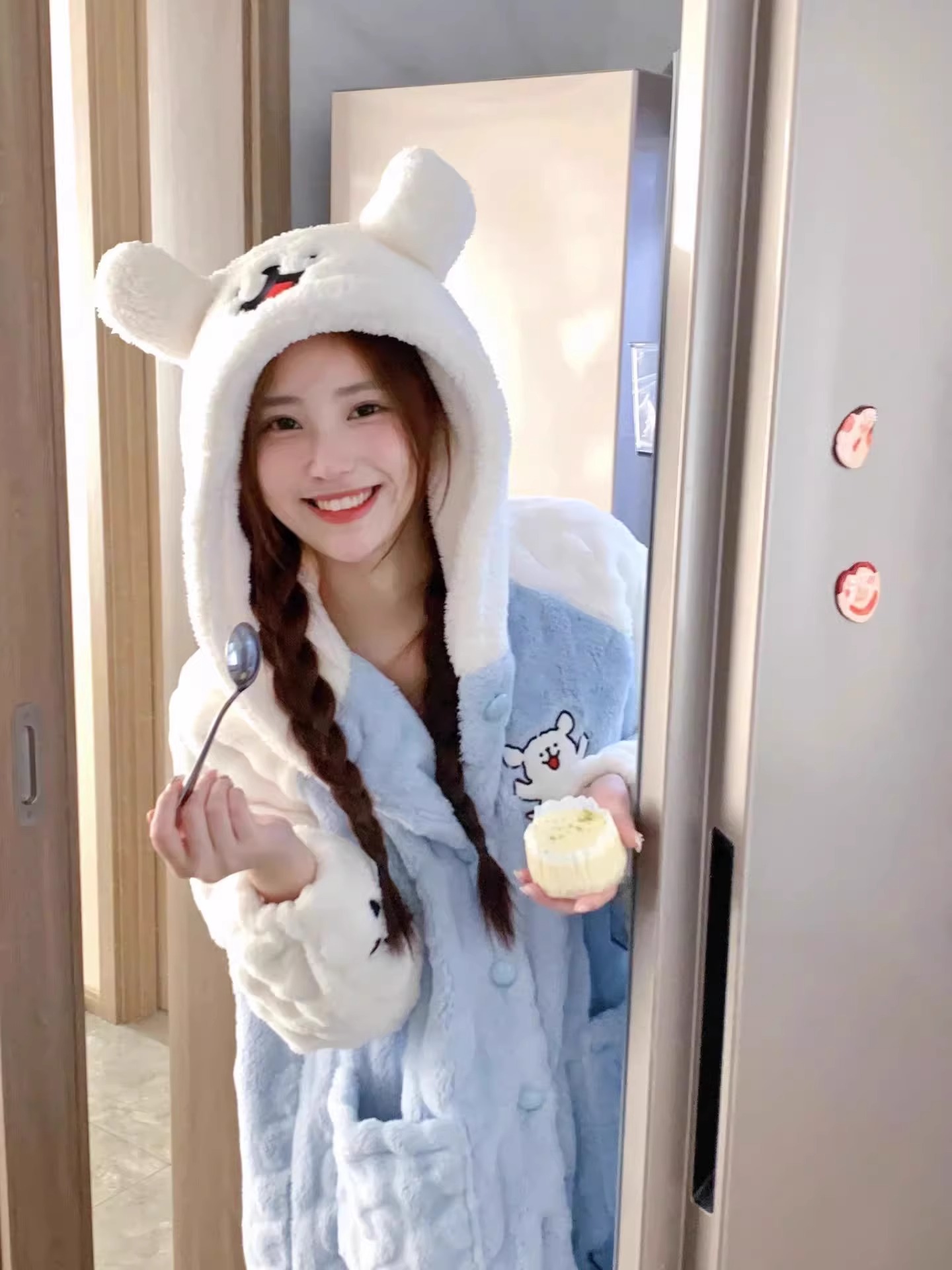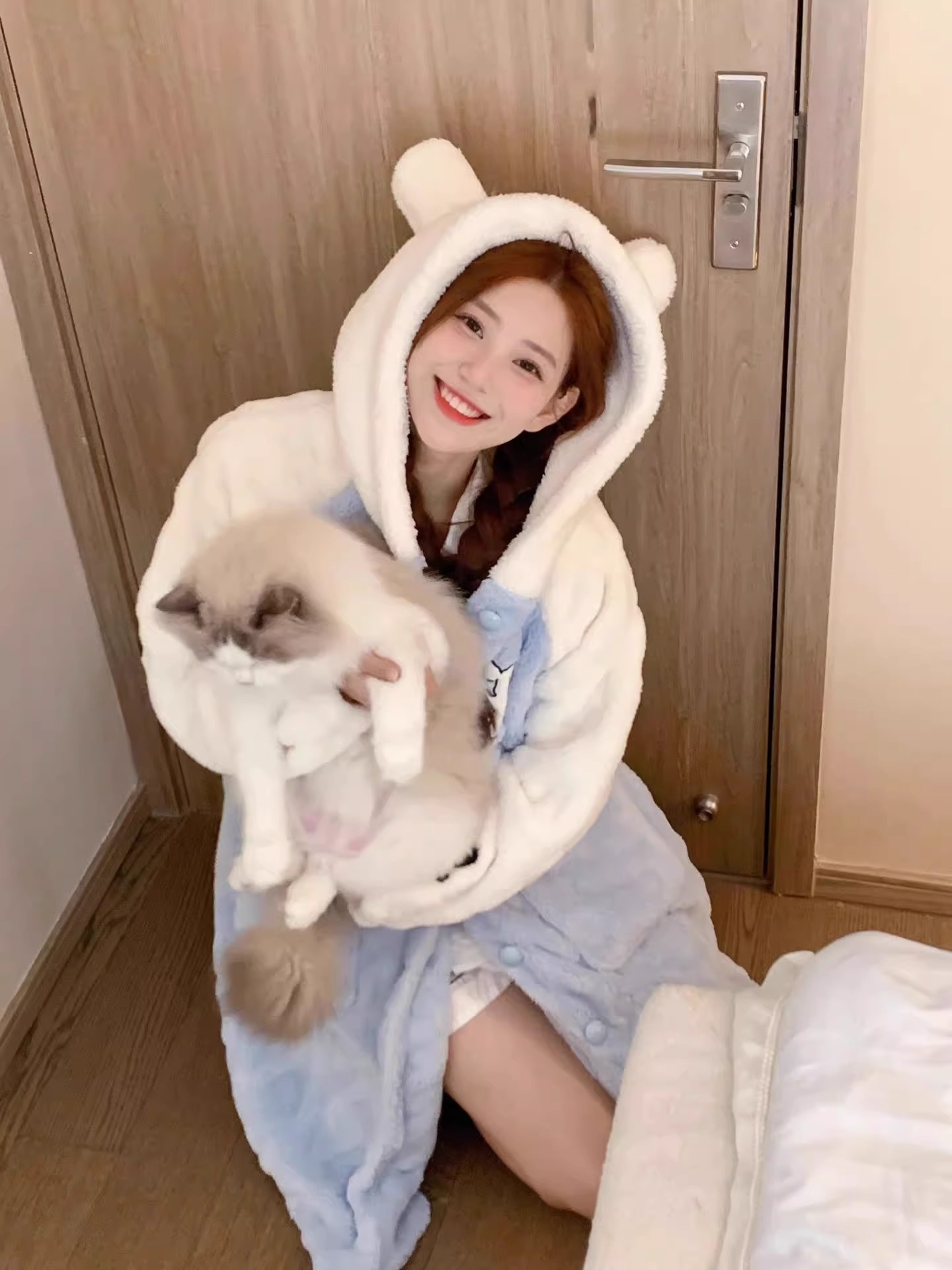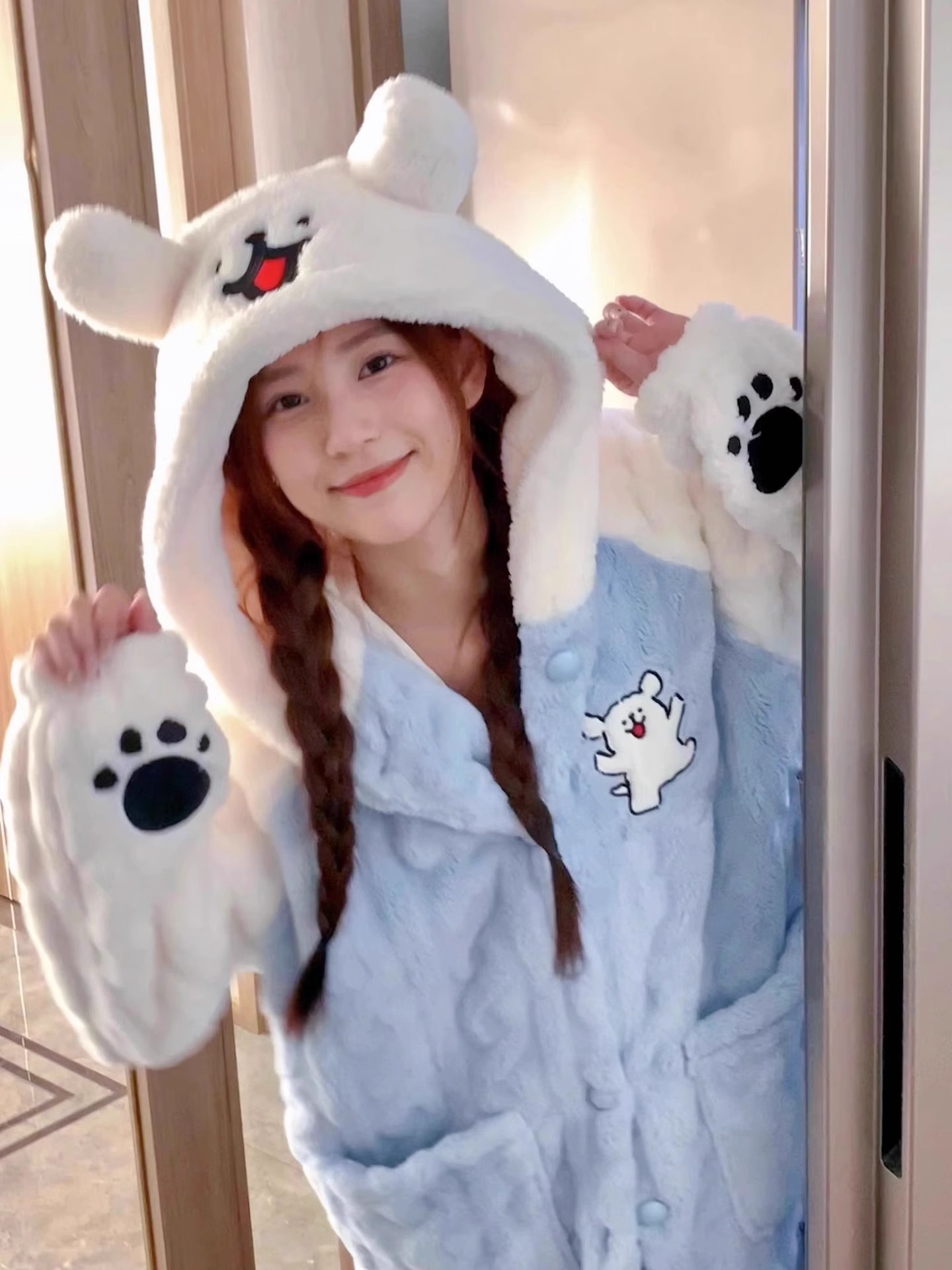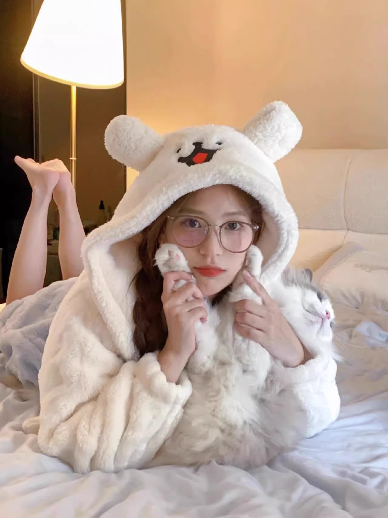 线条狗珊瑚提花绒睡衣女冬季加绒加厚保暖连帽袍套装可外穿家居服
