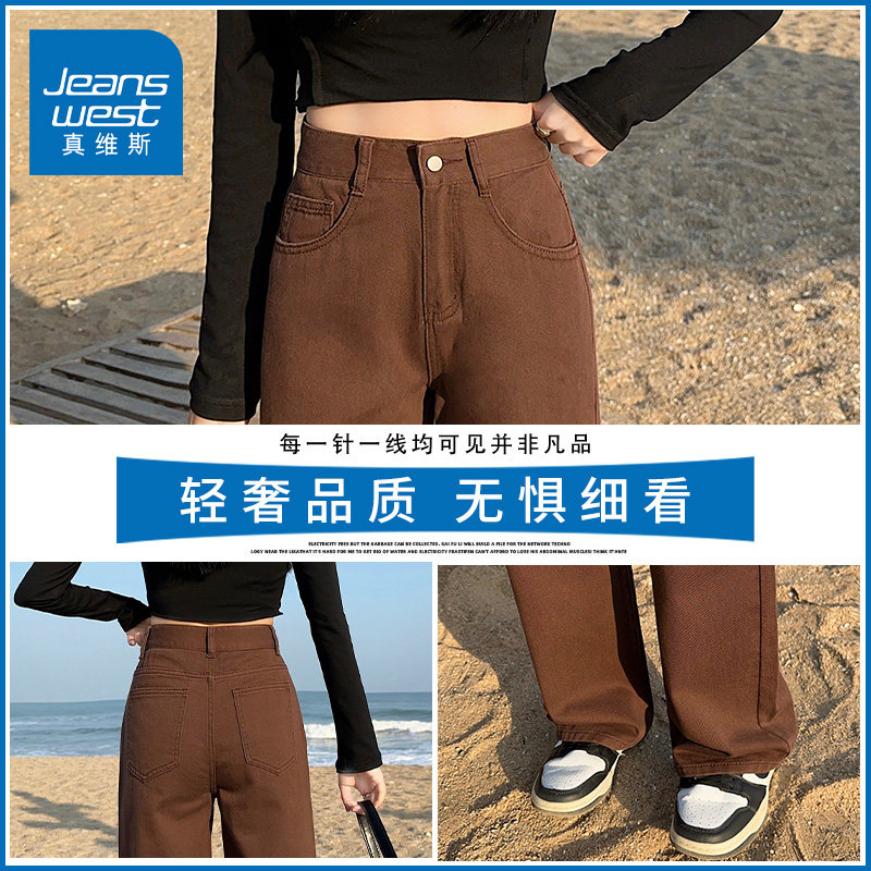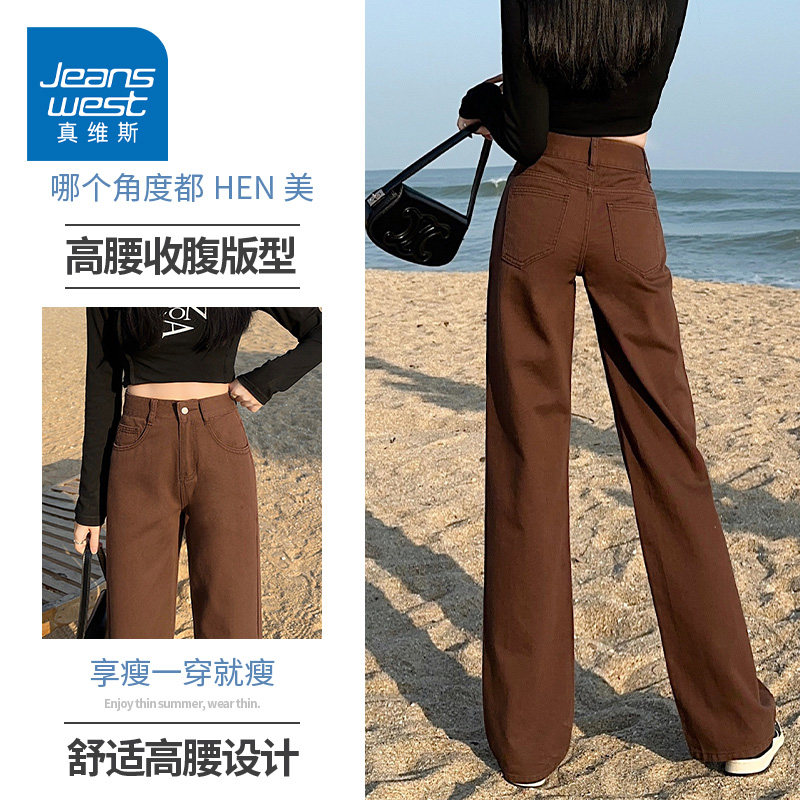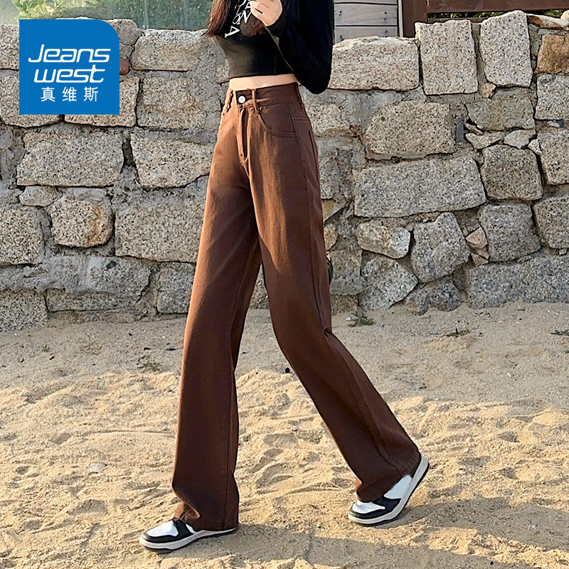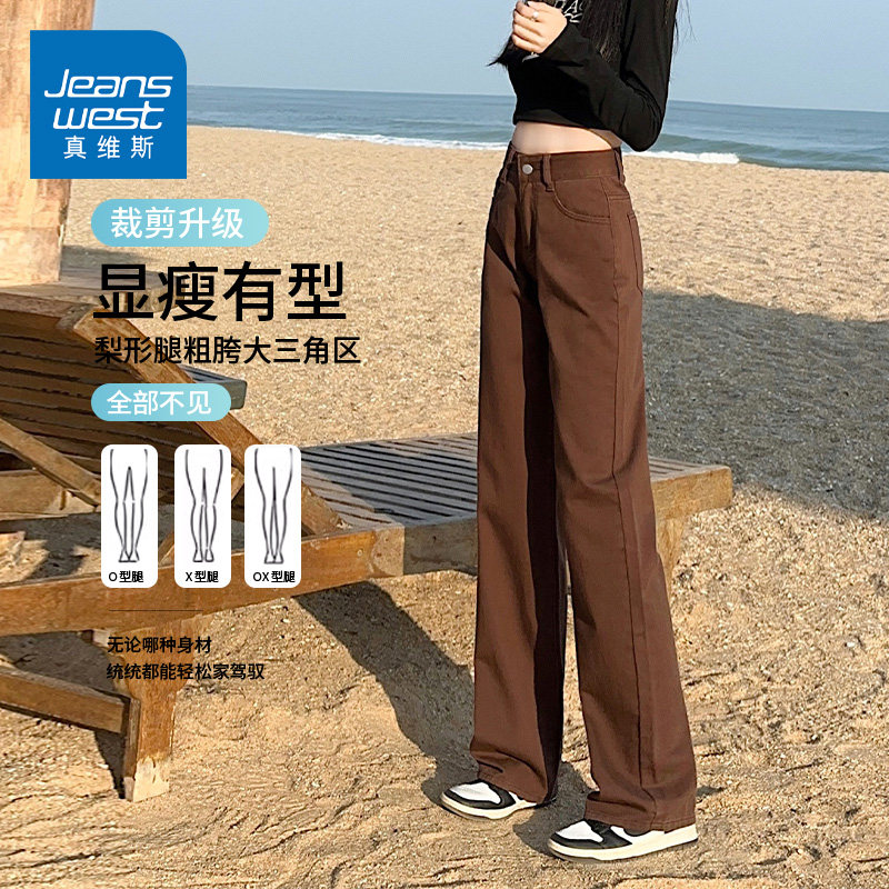 KZH真维斯咖色牛仔裤女春夏新款宽松直筒裤简约高腰显瘦阔腿长裤