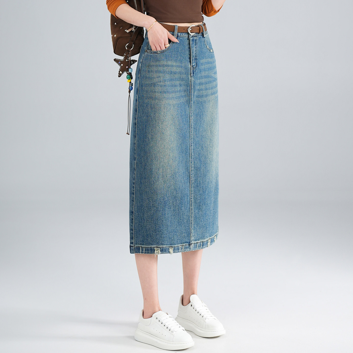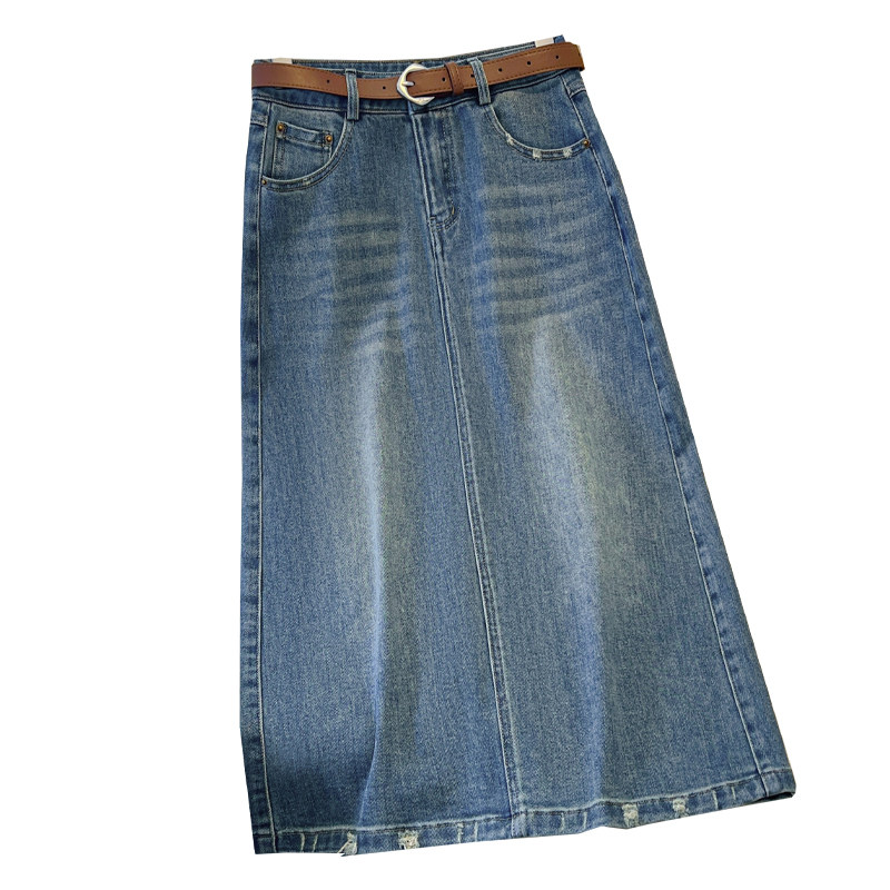 复古蓝牛仔中长半身裙女春季2026新款开叉一步裙显瘦遮胯直筒半裙