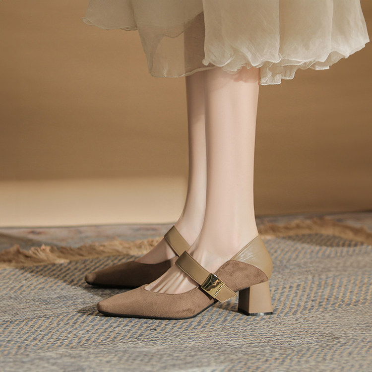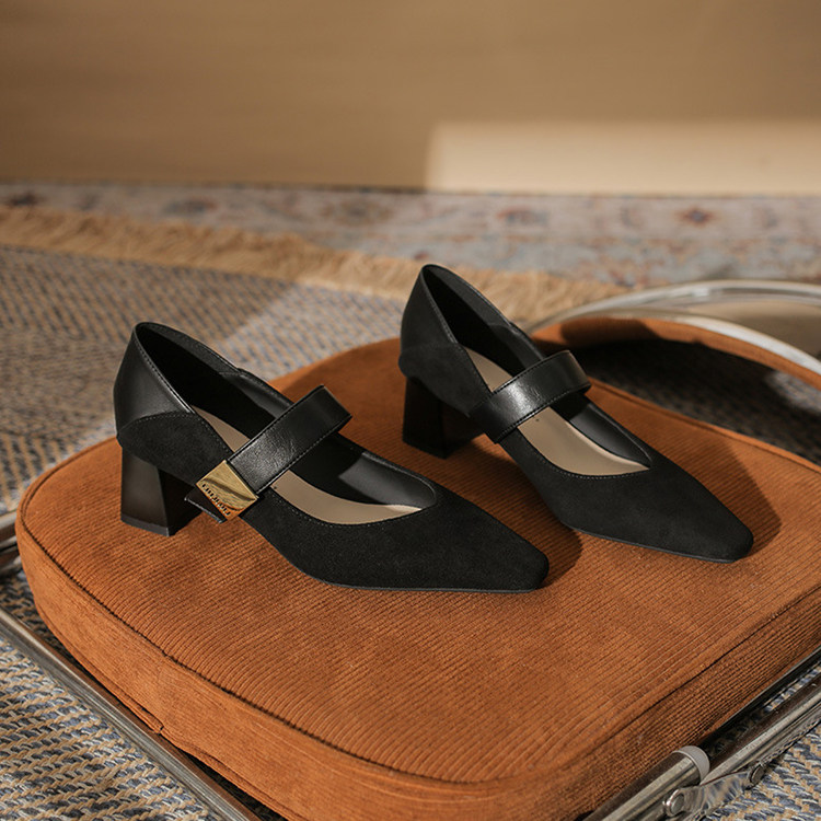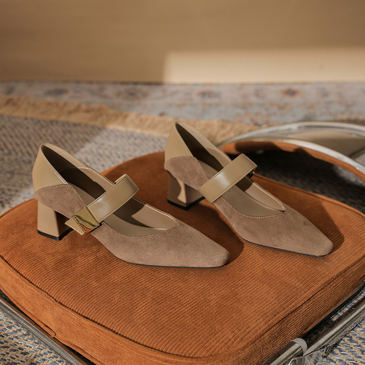 酒红色玛丽珍高跟鞋秋冬绒面方头粗跟5cm一字带女单鞋绝美不累脚