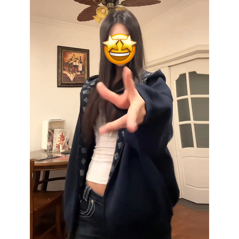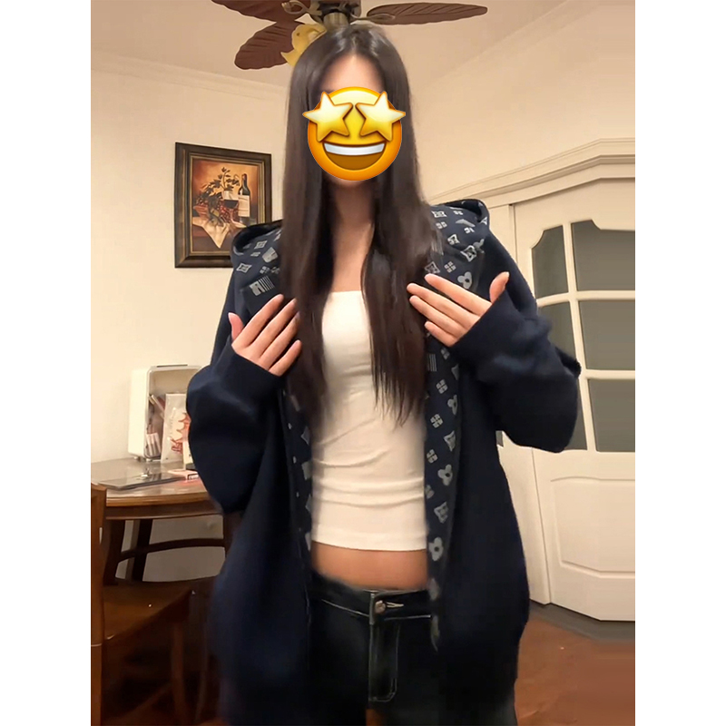 美式复古印花连帽开衫卫衣女秋季2025新款设计感小众宽松拉链外套