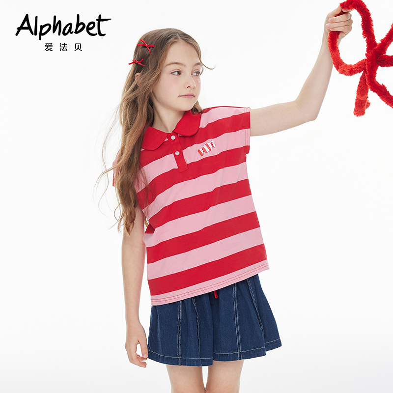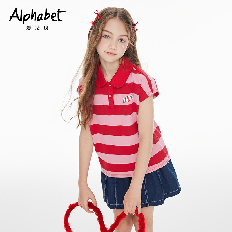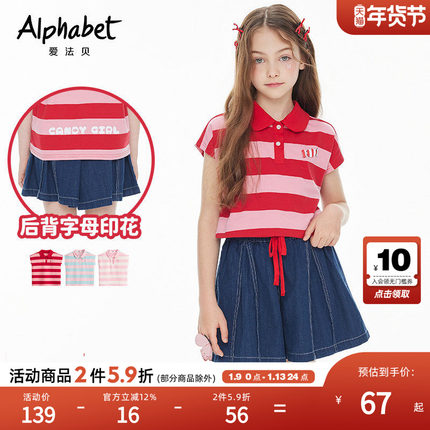 2025夏季女童条纹T恤短袖POLO衫中大儿童装洋气时髦体恤甜美套装