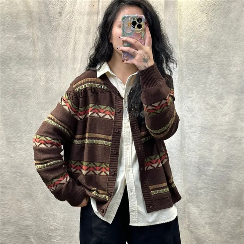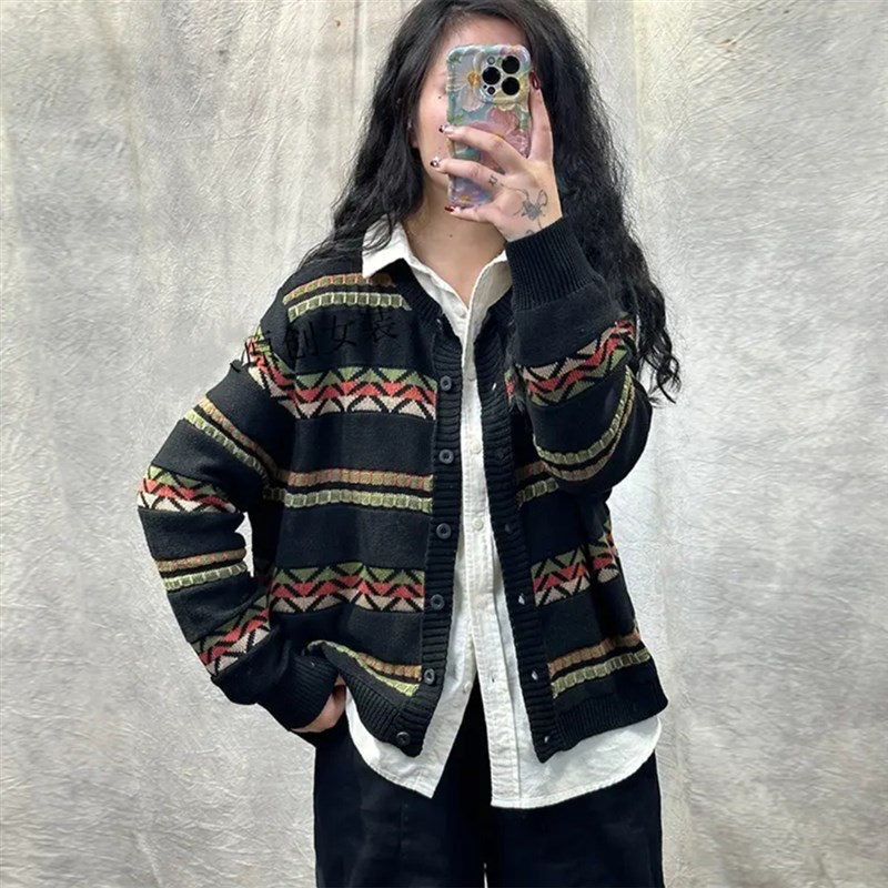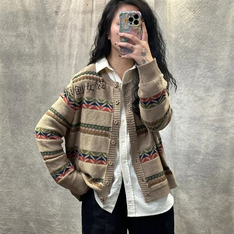 复古民族风红色条纹针织开衫女2024秋新款宽松慵懒毛衣外套上衣