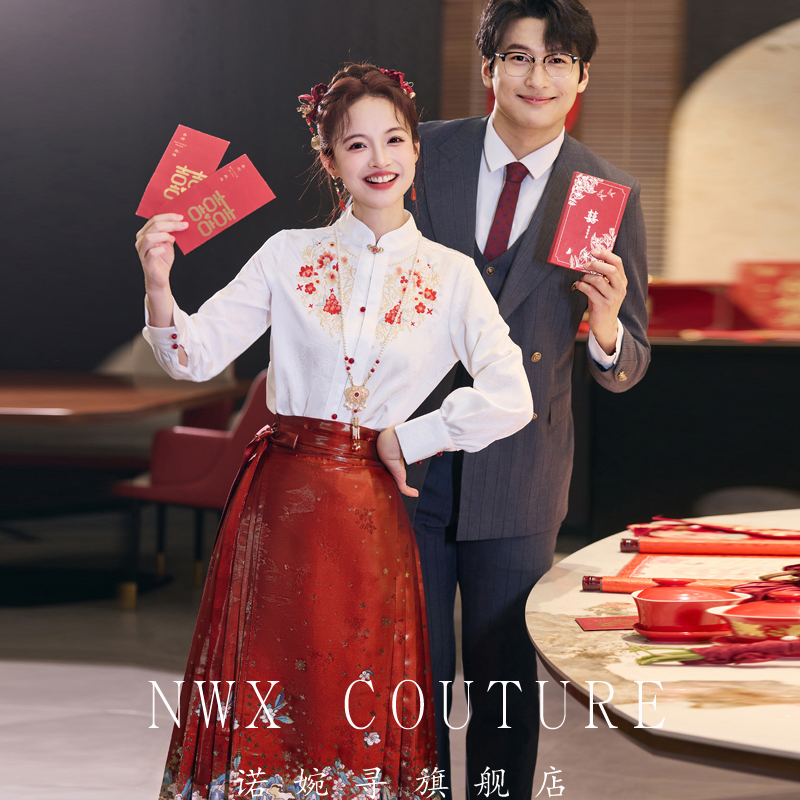 新中式重工红色马面裙刺绣衬衫汉服女结婚敬酒订婚礼服套装小个子