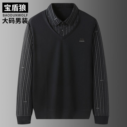 加大码男装春秋假二件长袖体恤衫特大号肥佬宽松中老年长袖打底衫
