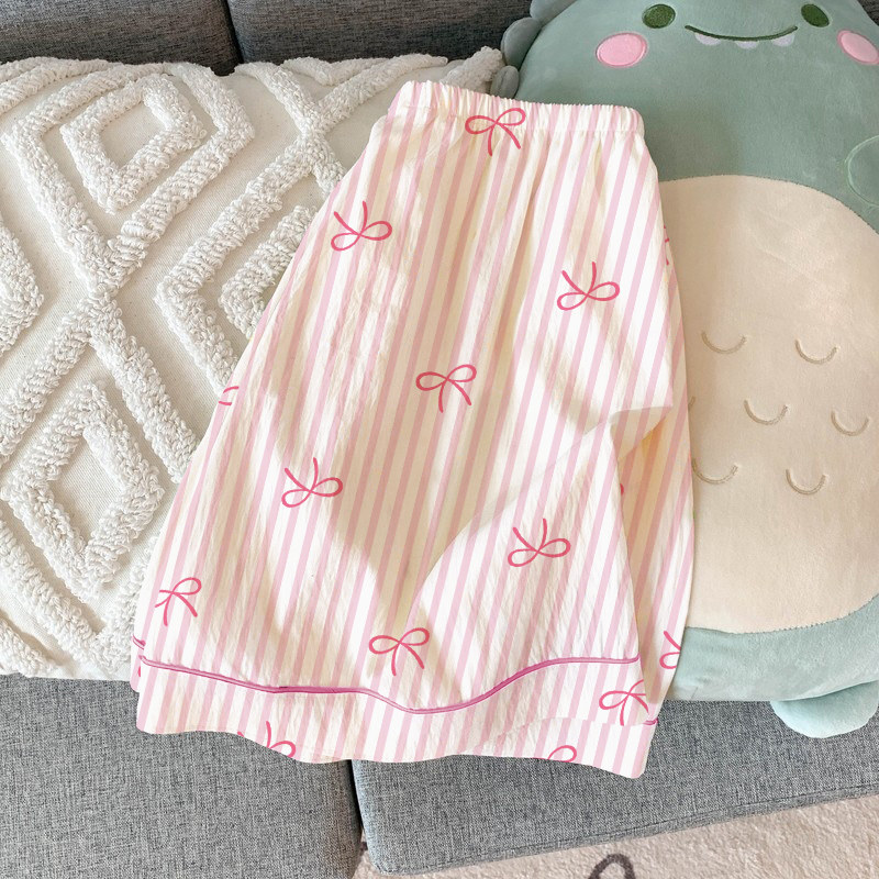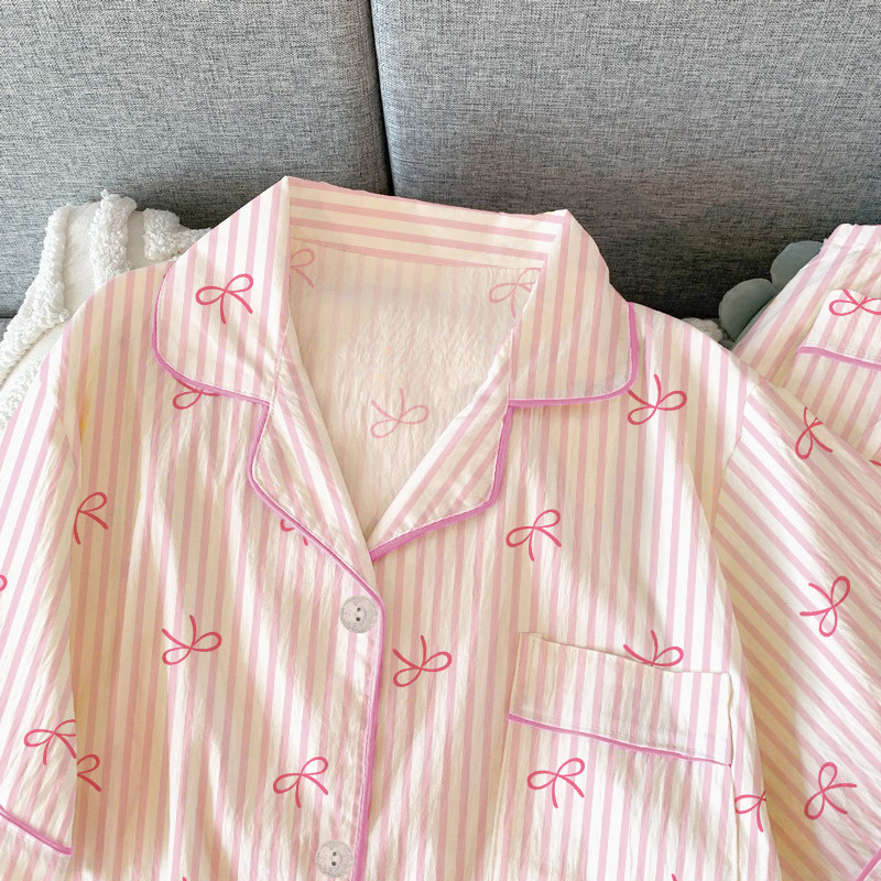 甜美条纹ins风蝴蝶结夏季睡衣少女短袖三件套韩版少女休闲家居服
