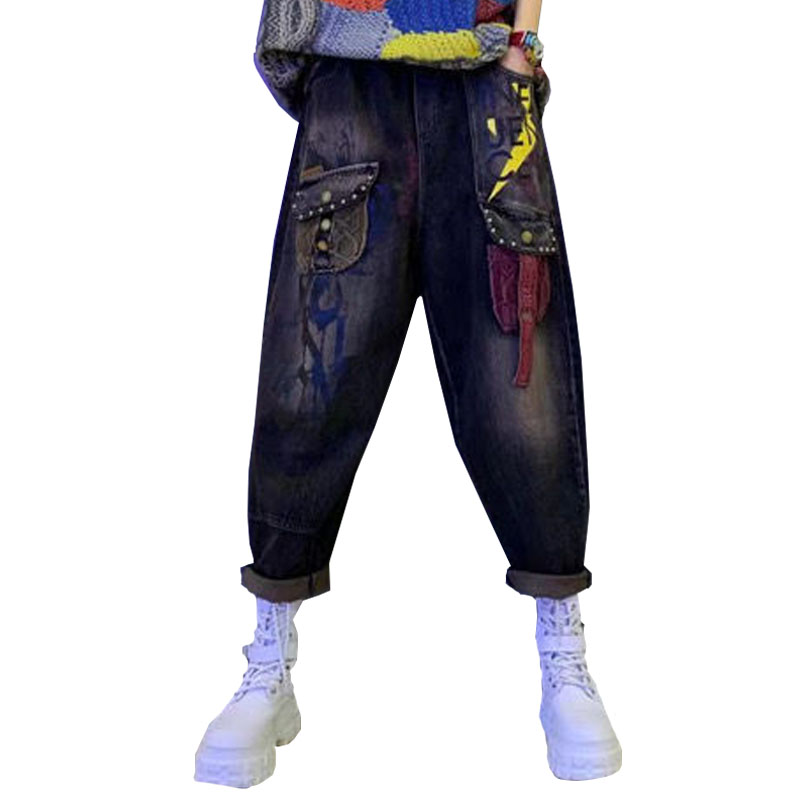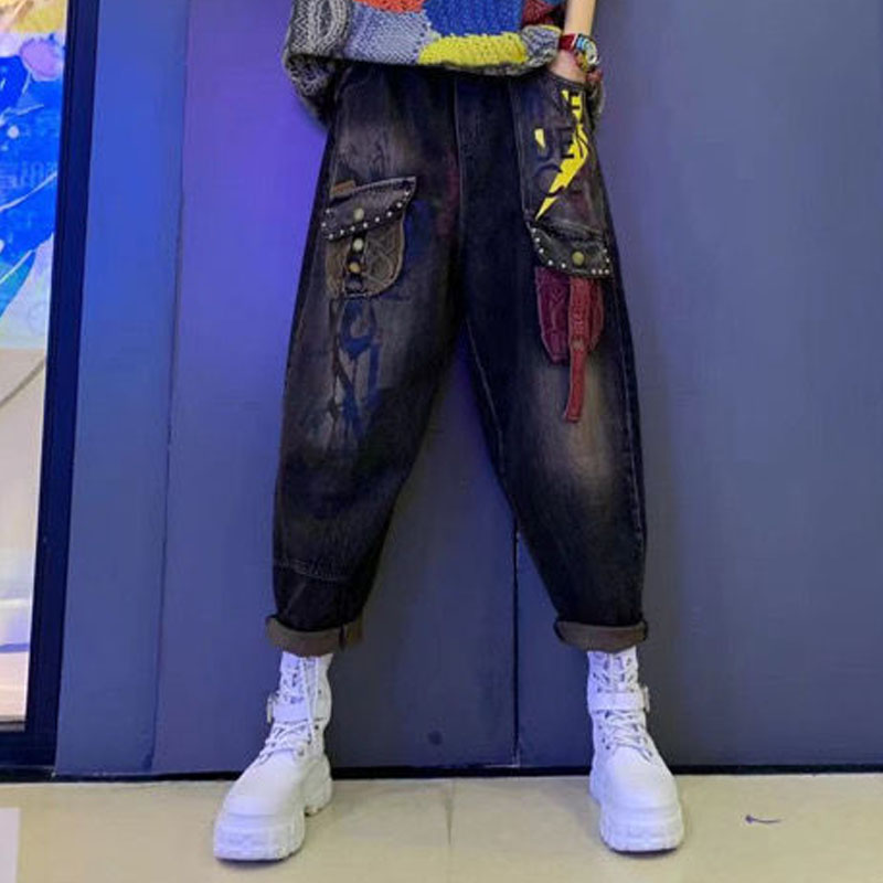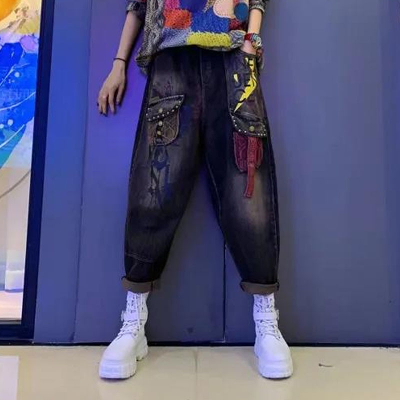 韩国东大门2025春春新款个性拼接钉珠印花哈伦裤女高腰显瘦牛仔裤