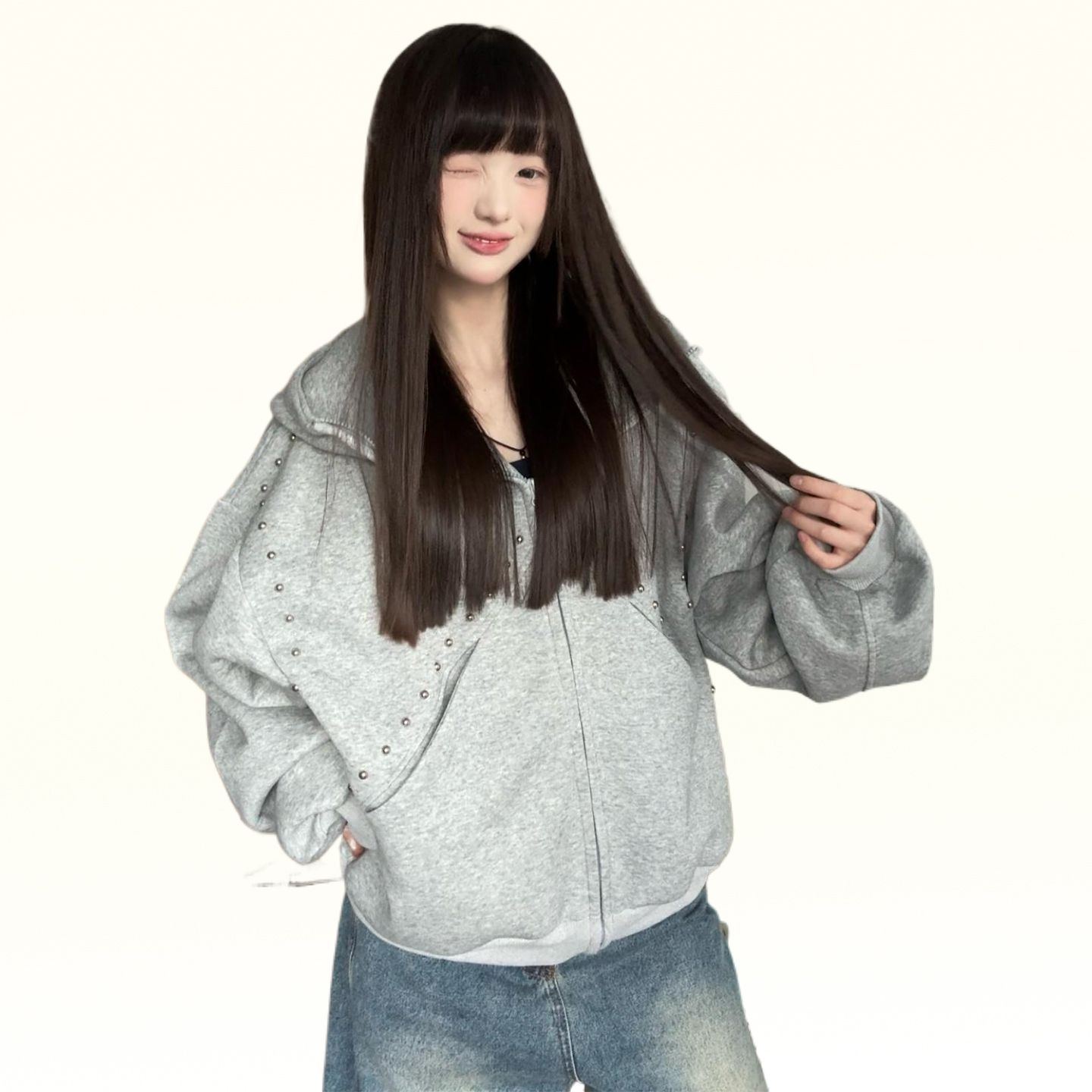 特大码灰色高级感连帽外套女胖mm美式vibe风铆钉耳朵设计开衫卫衣