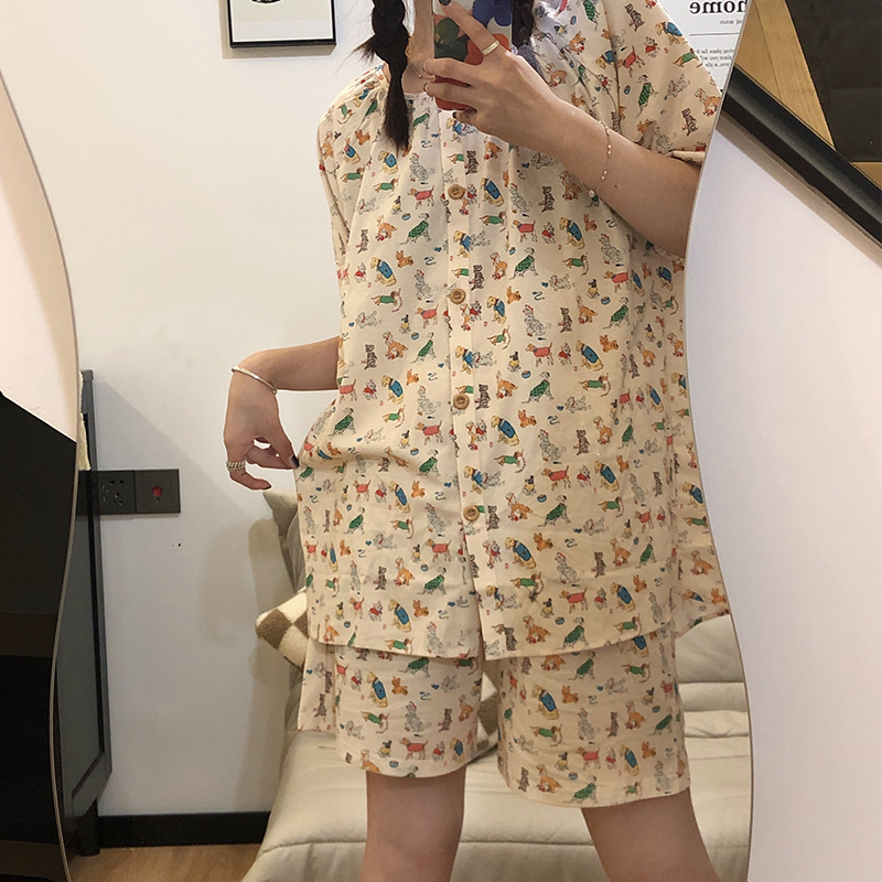 ins卡通狗狗纯棉睡衣女圆领宽松夏季家居服日系2023短袖短裤套装