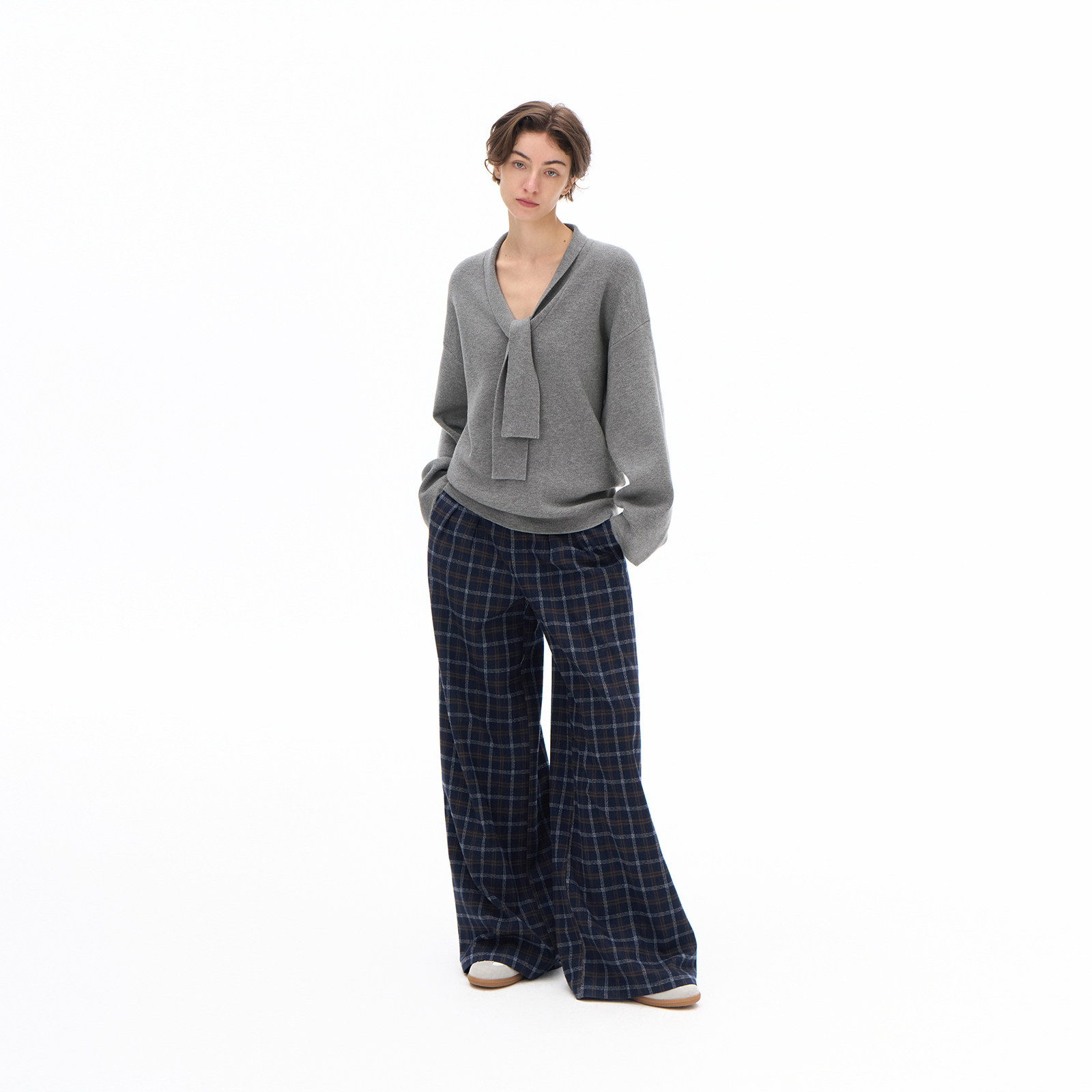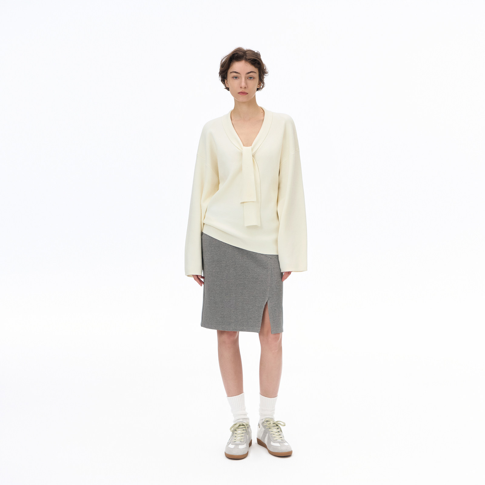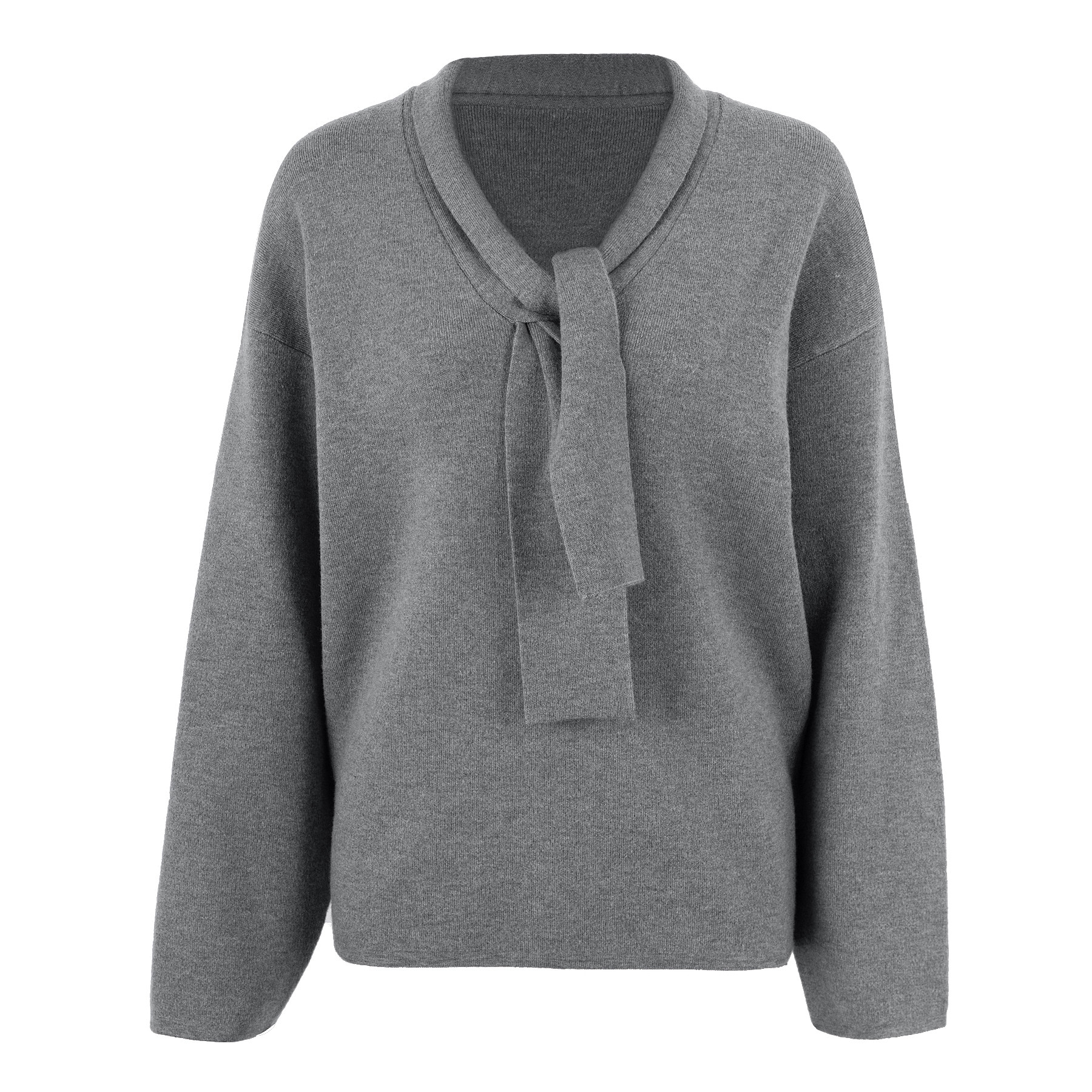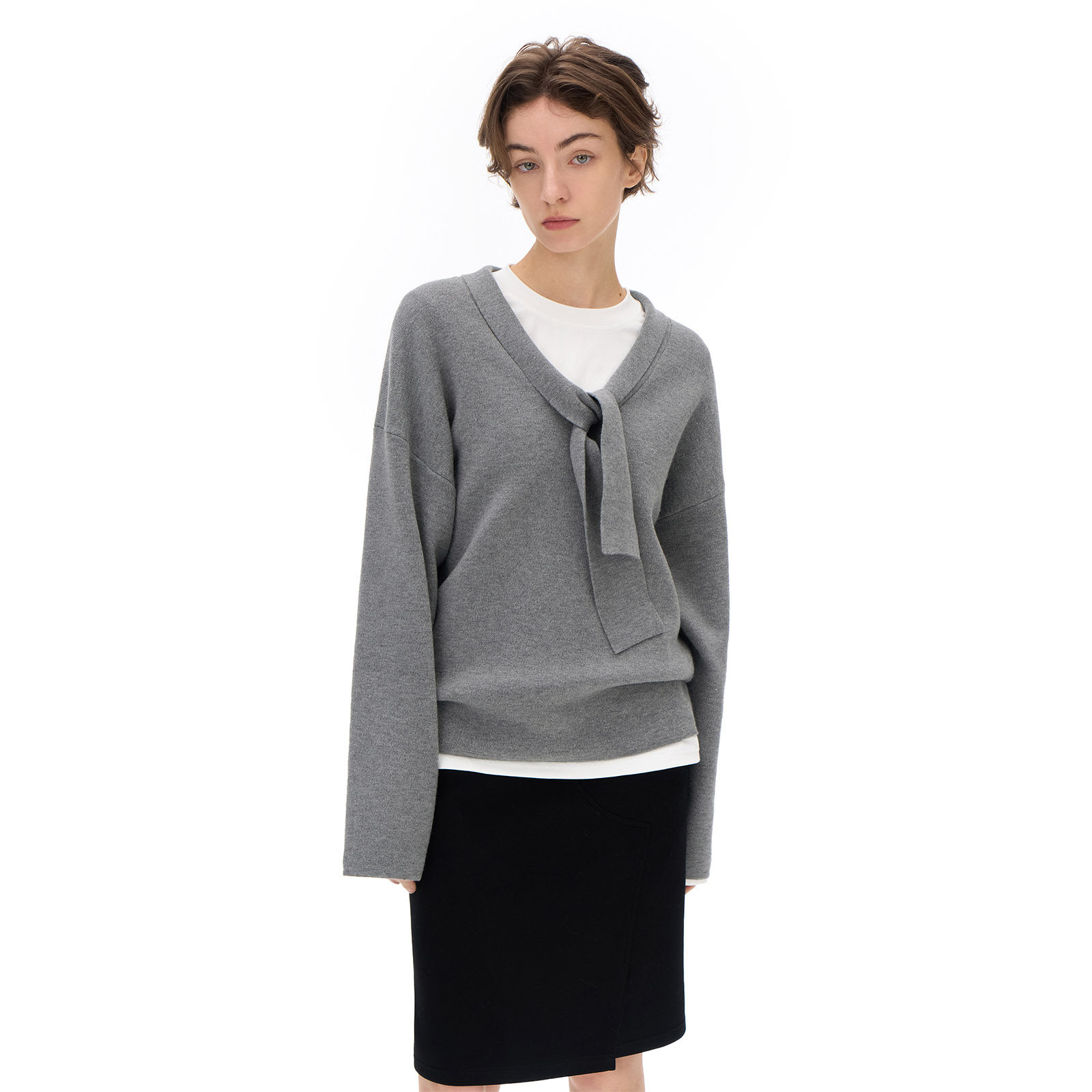 call it a day 灰色/白色V领宽松系带羊毛针织上衣女慵懒套头毛衣