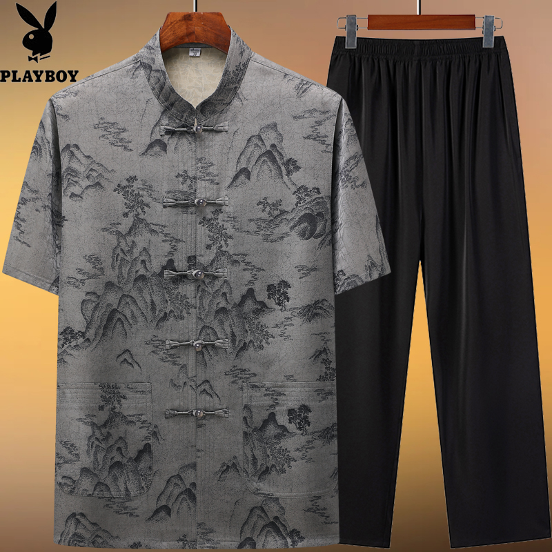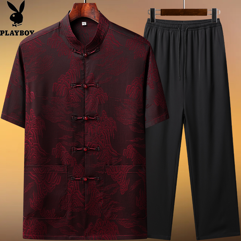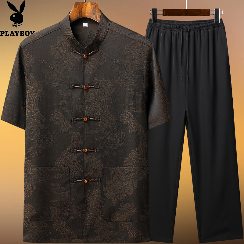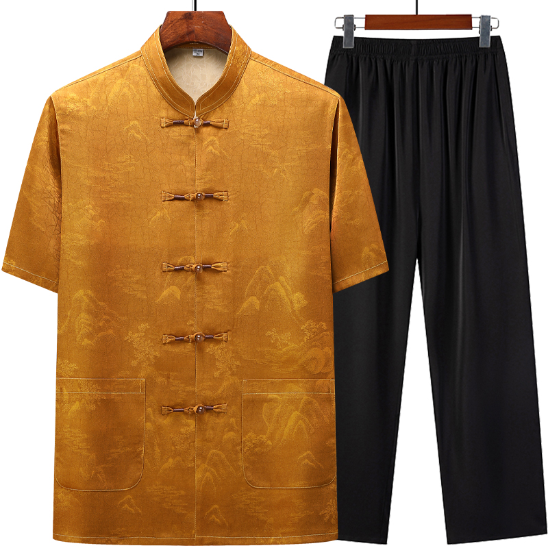 夏季冰丝短袖唐装男中老年套装中国风爷爷高端衣服老人过寿星汉服