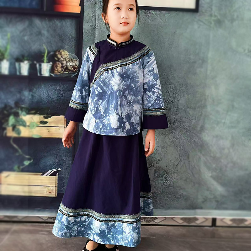 布依族服装女童民族风扎染套装女立领唐装复古两件套春秋上衣裙子