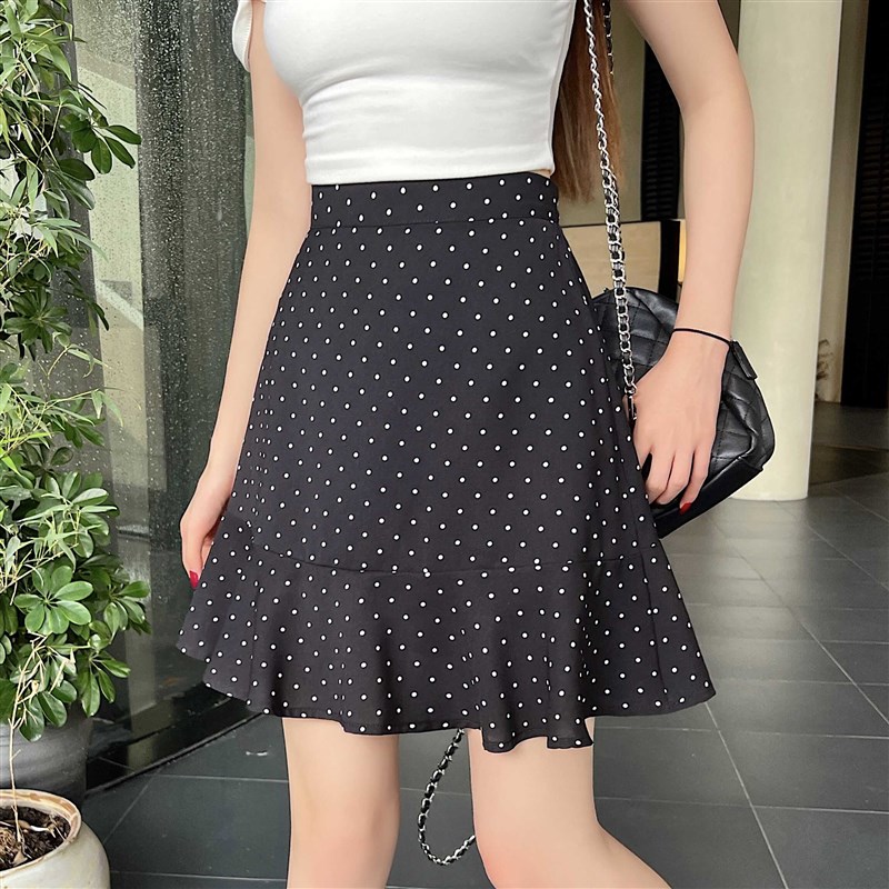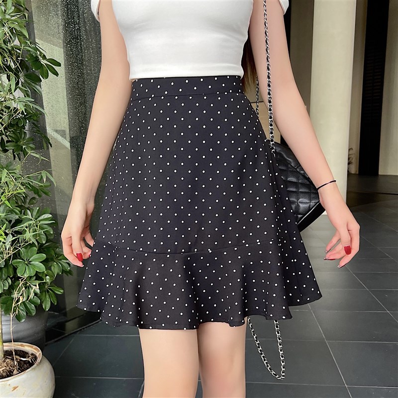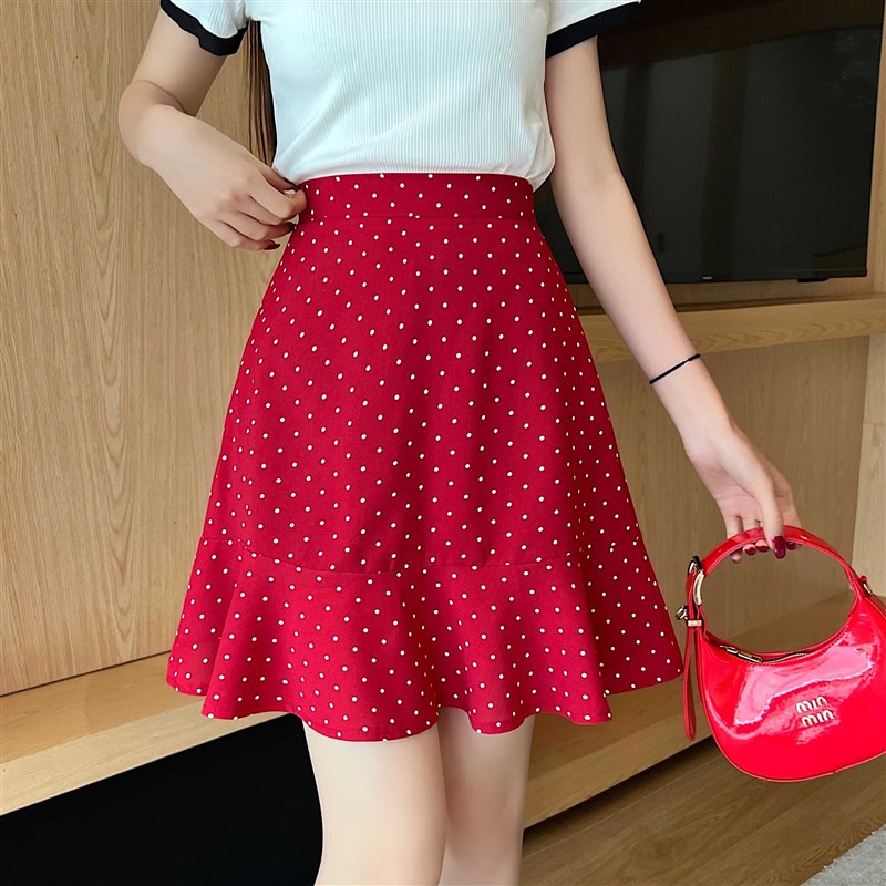夏季高腰波点A字裙半身裙大码百搭甜美短裙红色复古防走光鱼尾裙