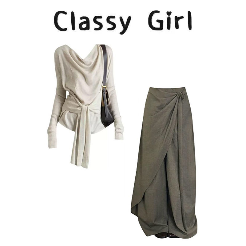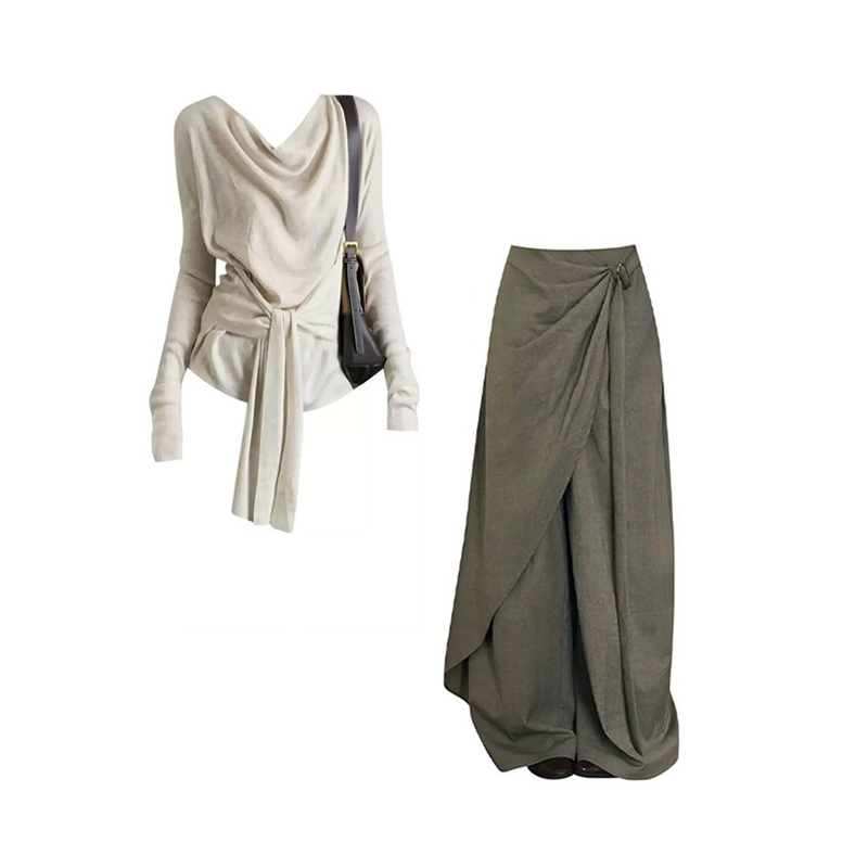 大方得体穿搭一整套秋日辣妹荡领绑带上衣不规则垂感西装裤套装