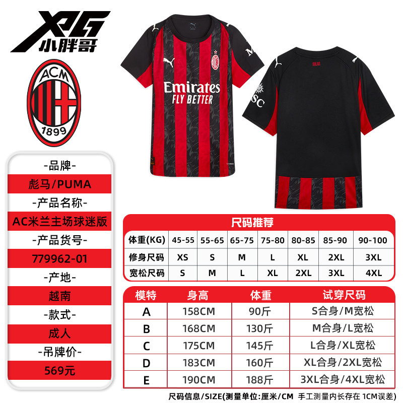 小胖哥XPG彪马25-26赛季AC米兰主场球迷版球衣短袖成人足球服男女
