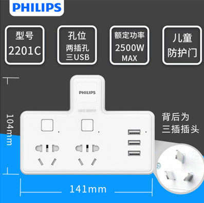 飞利浦插座转换器多孔面板无线不带线插排一转二多家用功能分插头