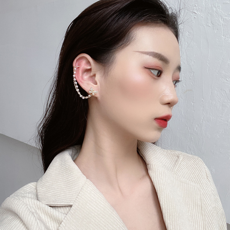 s925银针新潮蝴蝶耳环创意不对称珍珠链条耳骨夹甜美镶钻耳饰饰品