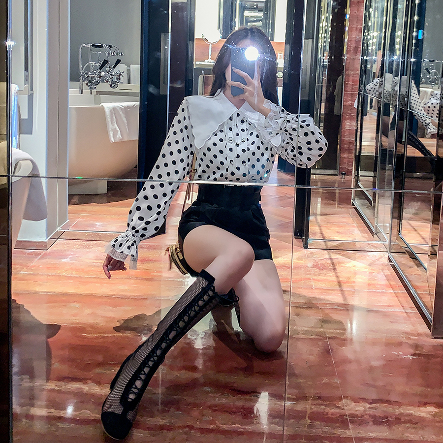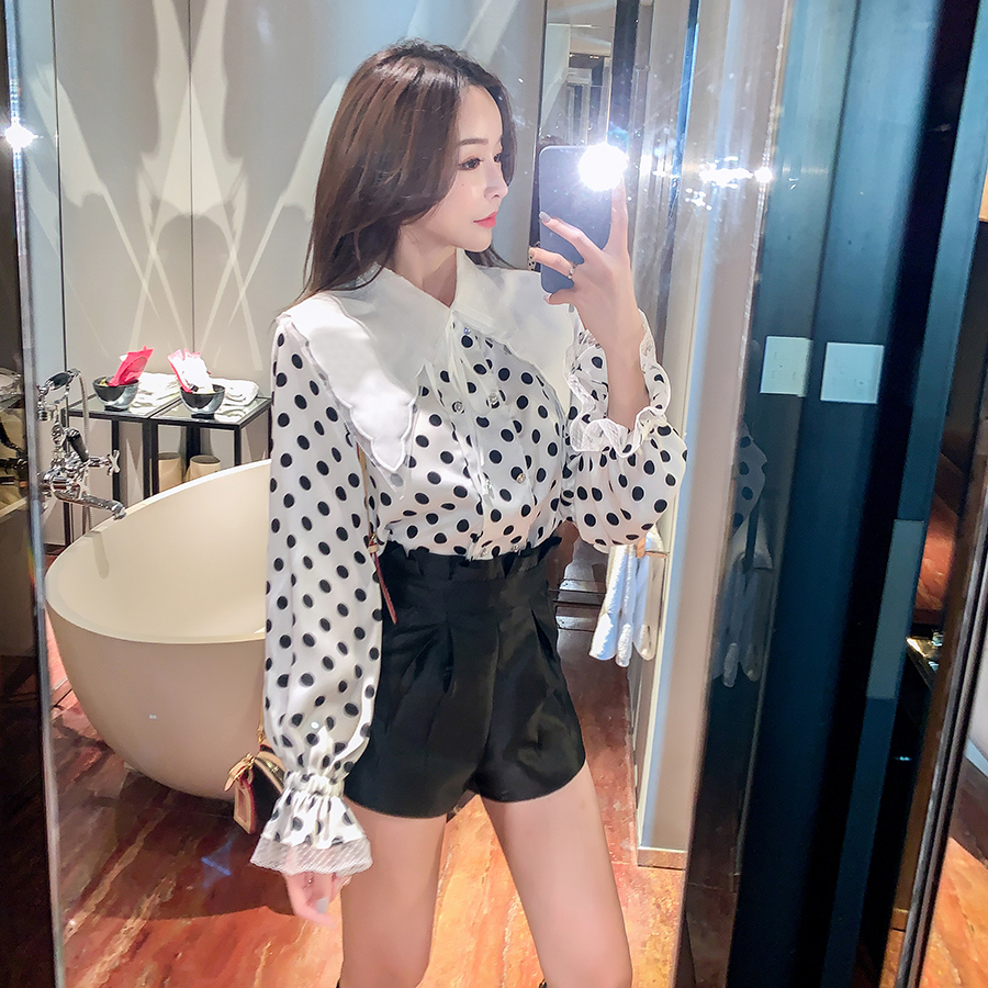 2022夏新款设计感小众轻熟法式波点上衣白色波浪边翻领衬衣衬衫女