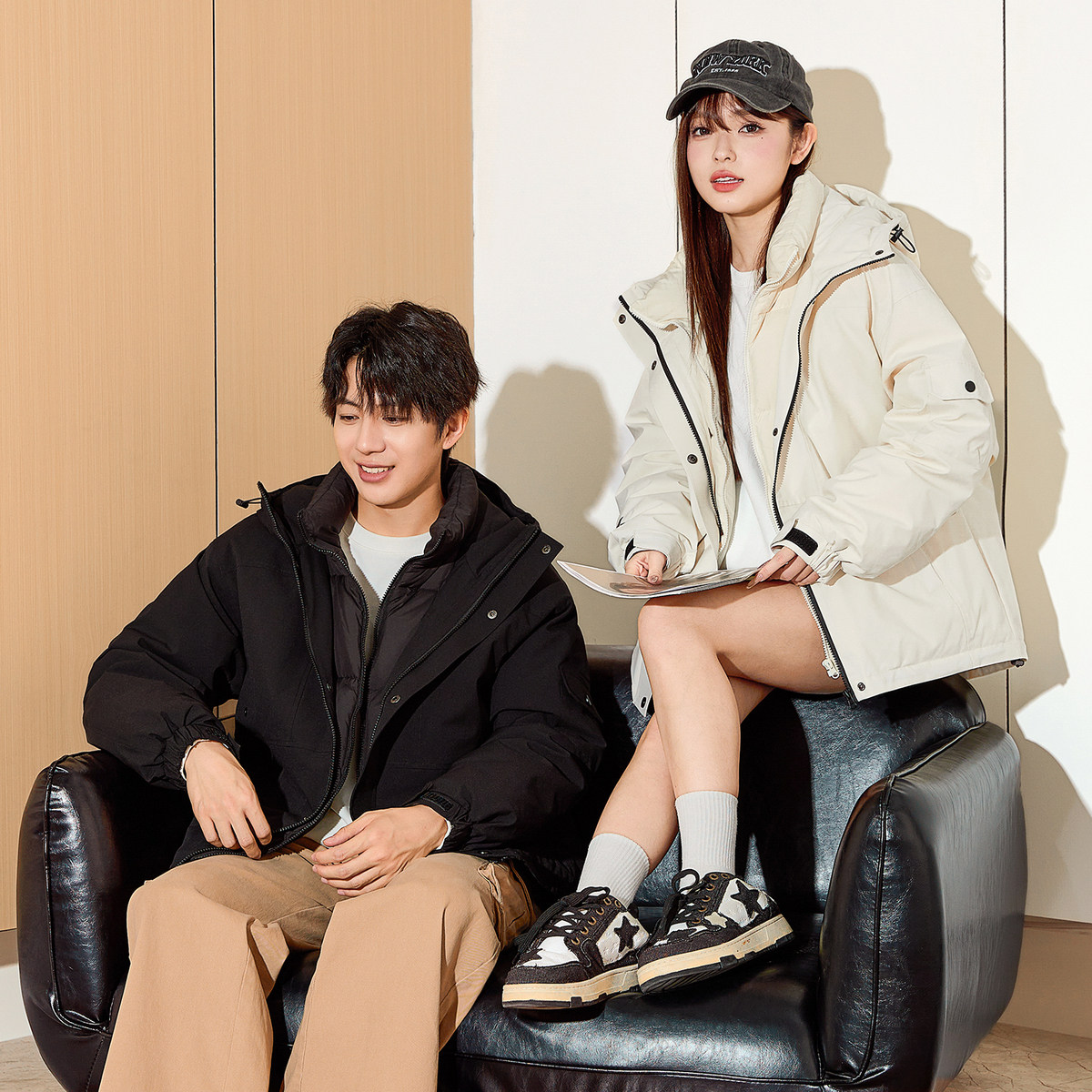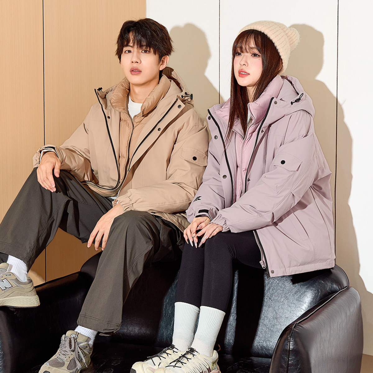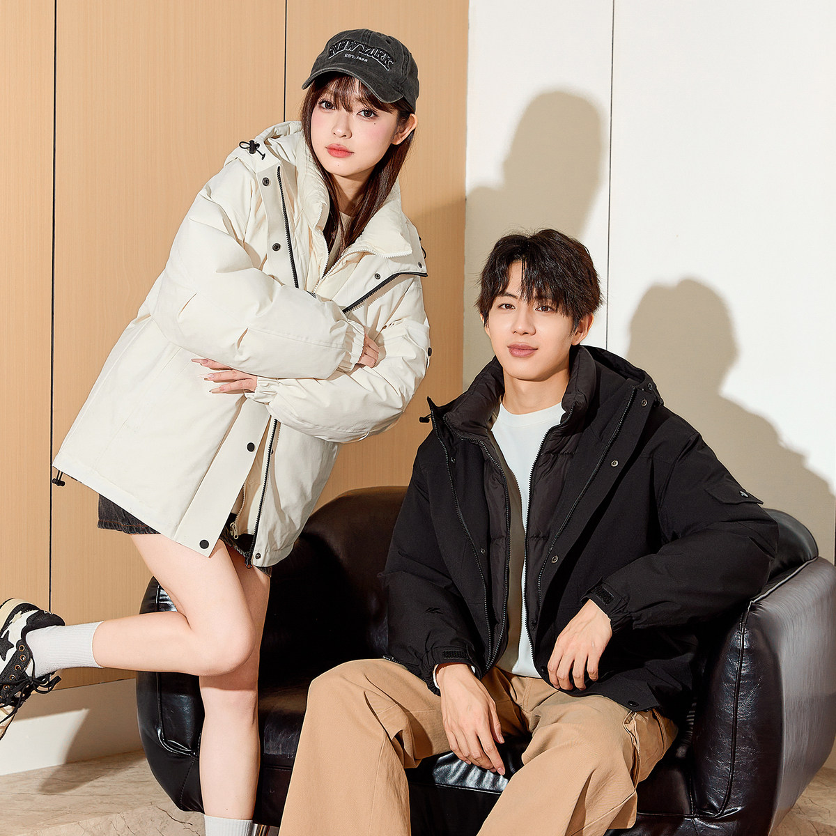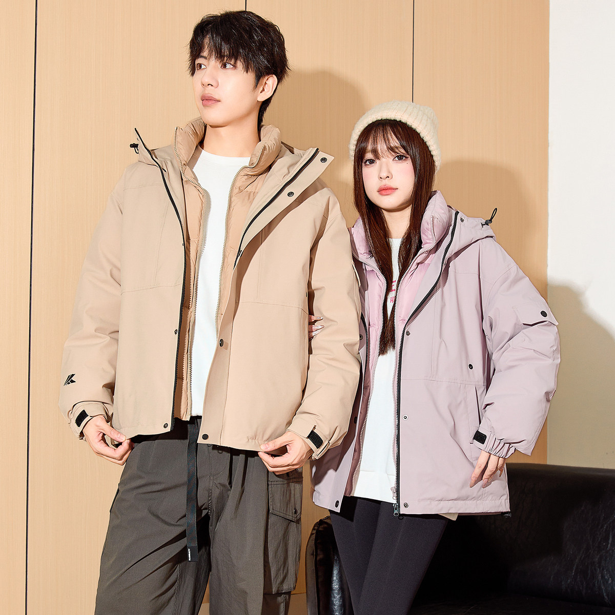 唐狮冬季情侣羽绒服男女连帽短款假两件工装冲锋少年外套上衣
