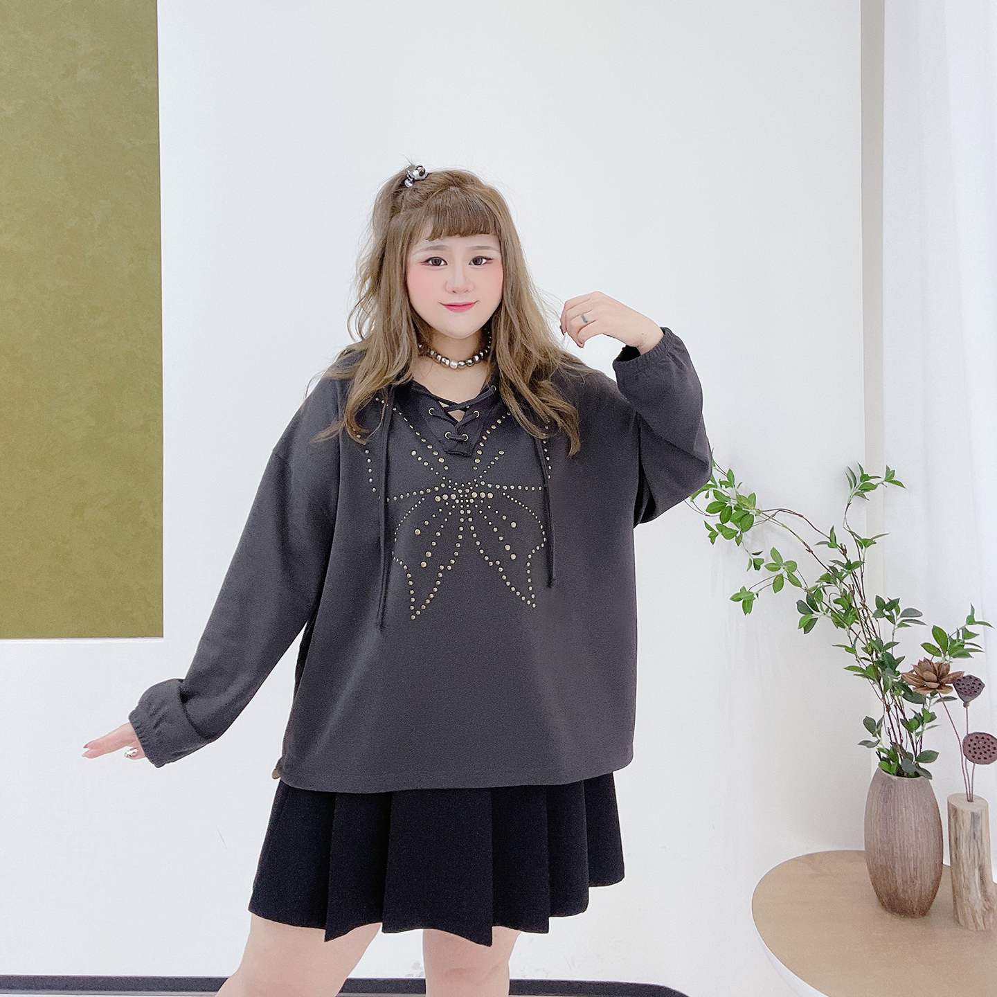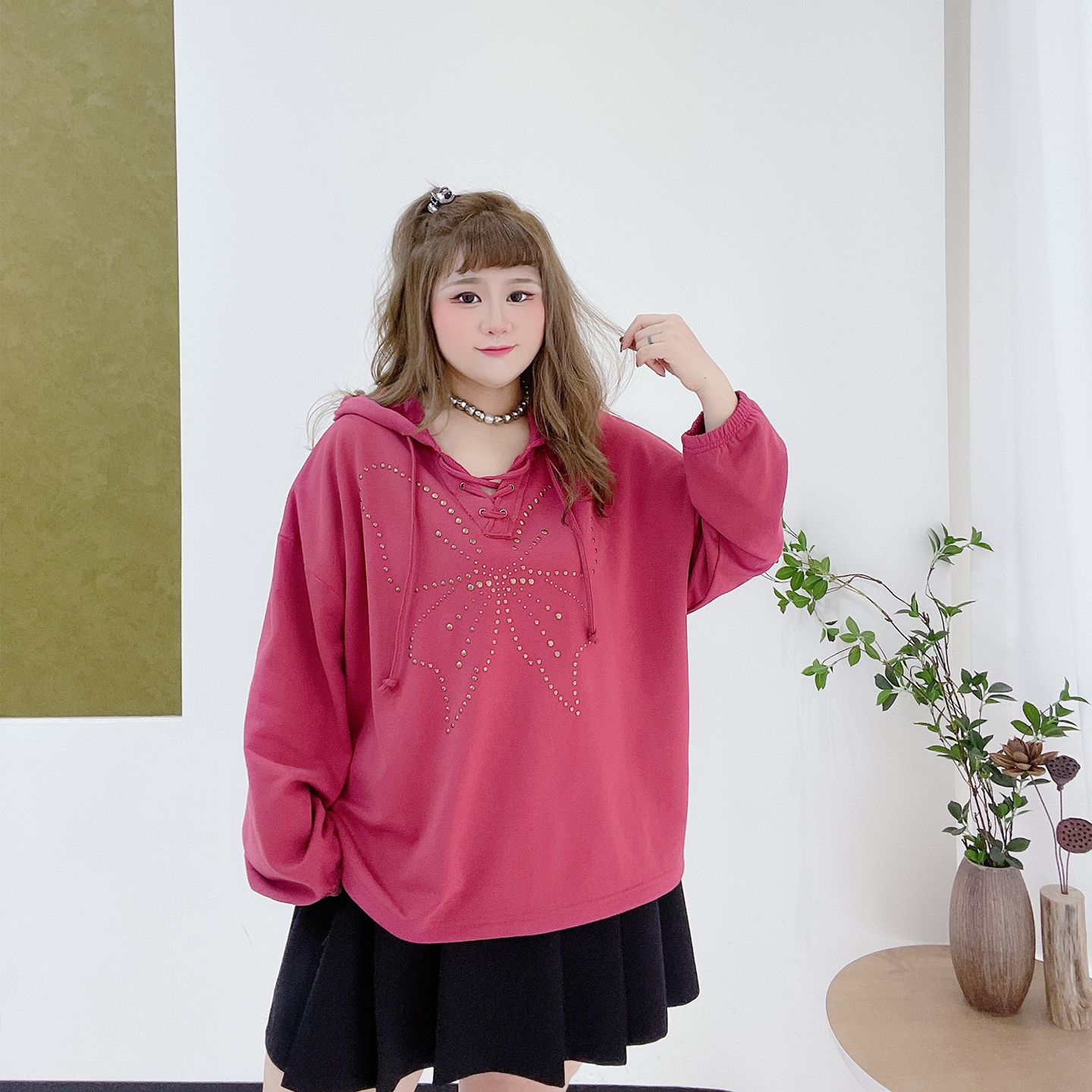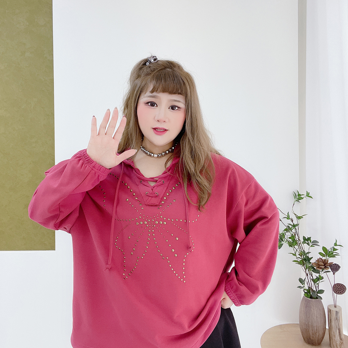 胖莹大码女装秋款少女感减龄美式学院风蝴蝶铆钉系带V领连帽卫衣