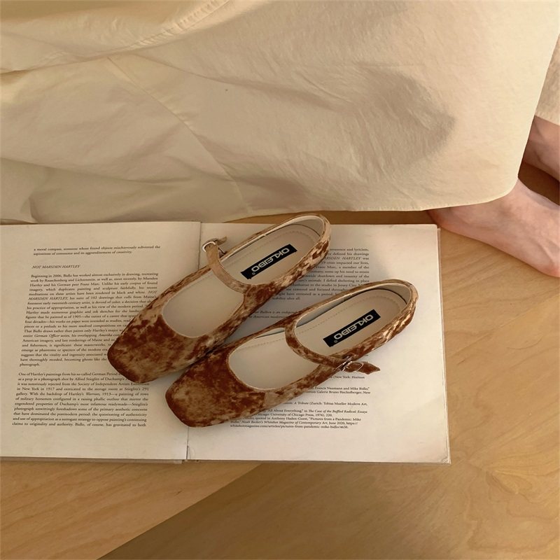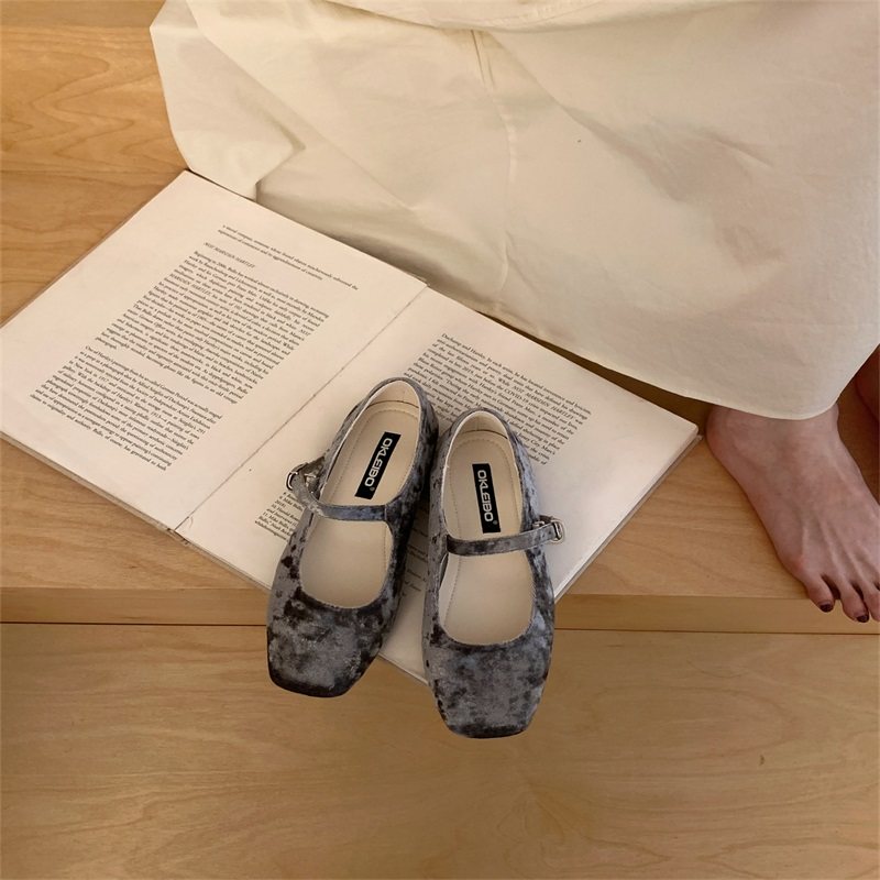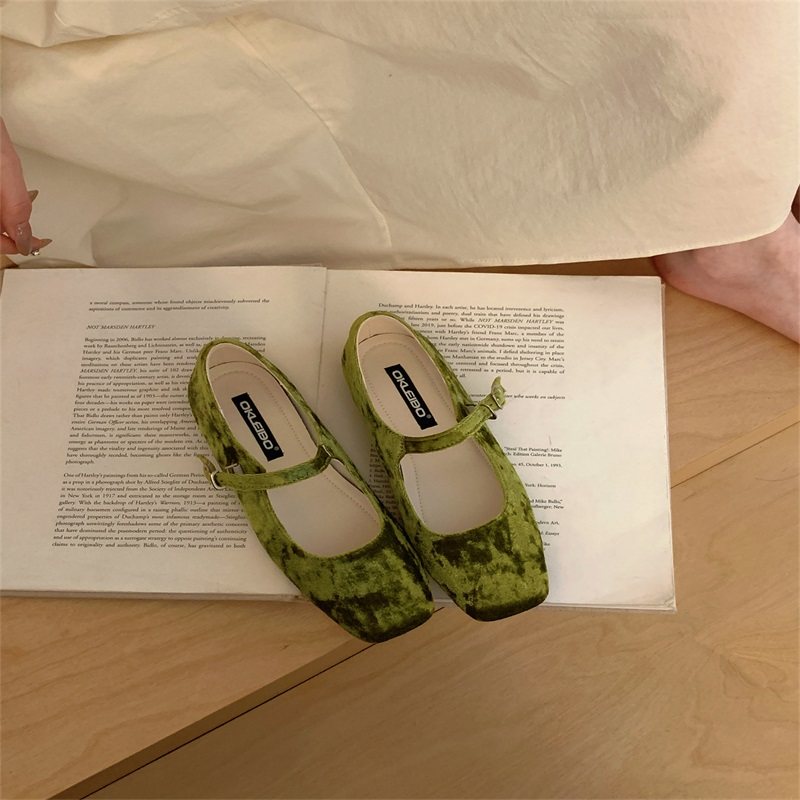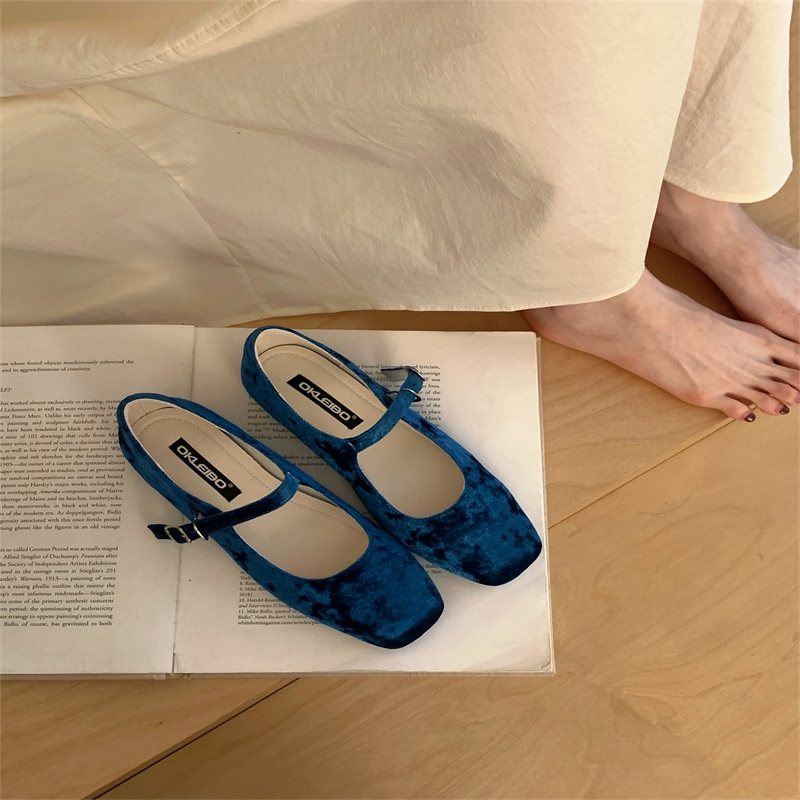 2025年新款法式方头低跟绒面玛丽珍鞋子女一字扣带浅口粗跟单鞋子
