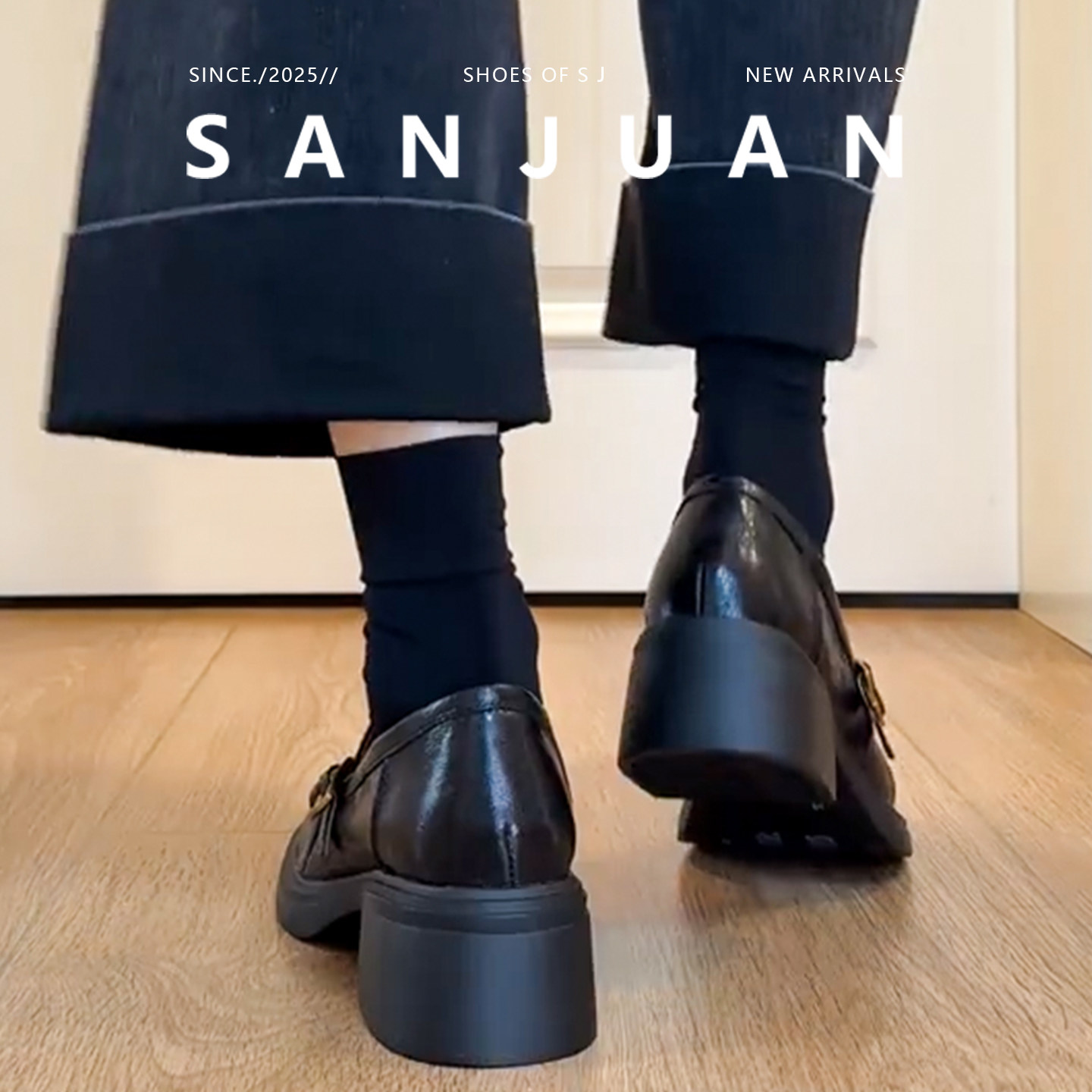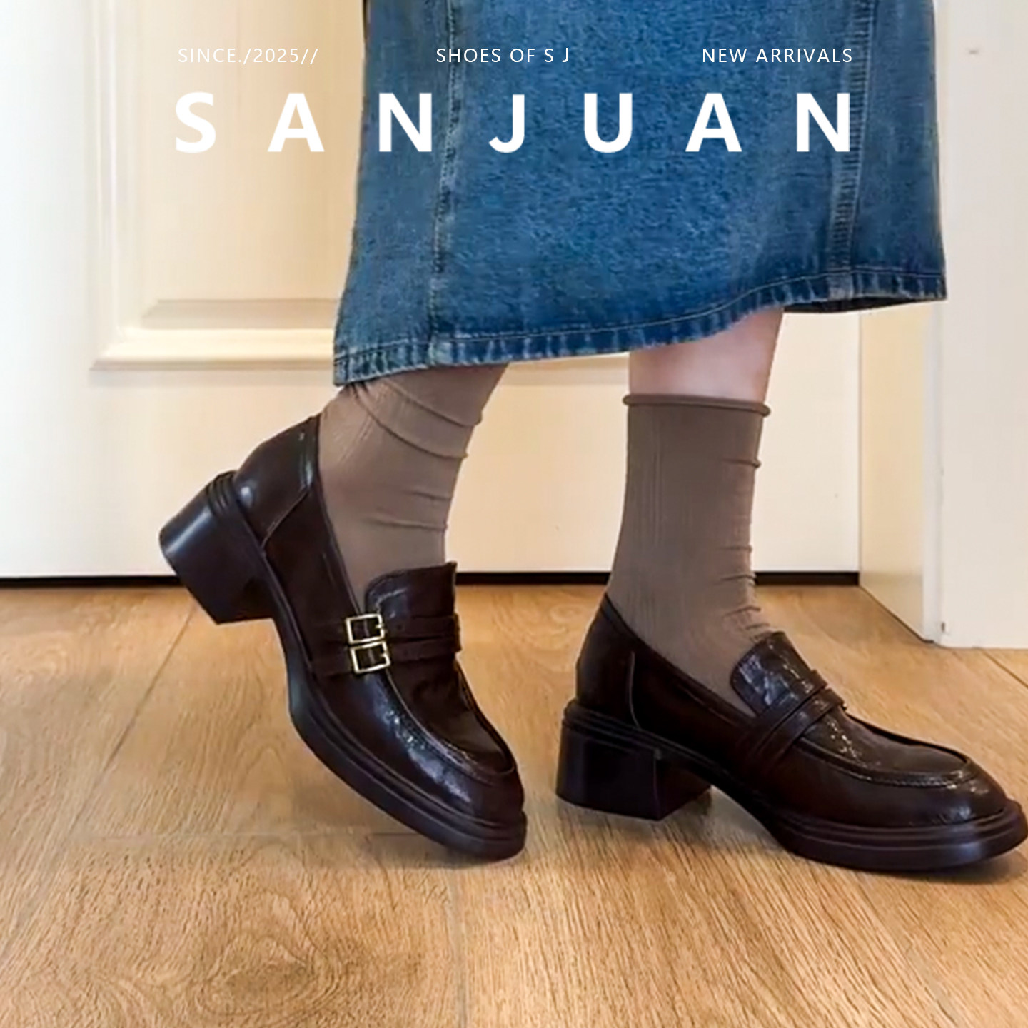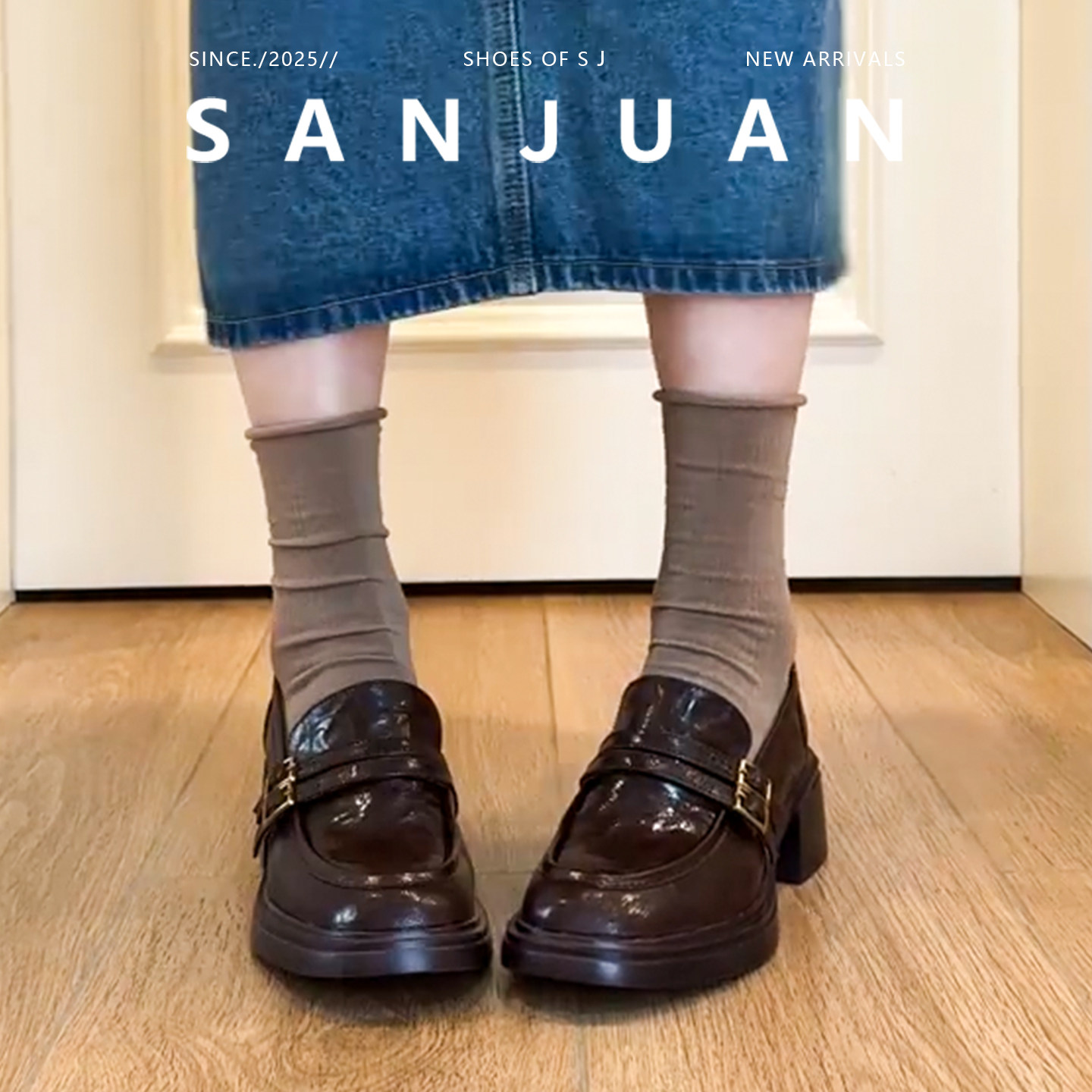 羊皮版sanjuan三卷乐福鞋棕色真皮粗跟单鞋中跟英伦小皮鞋一脚蹬
