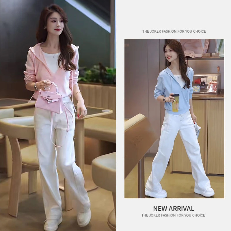 春季时尚一整套女装2025新款韩版假两件连帽上衣高腰牛仔裤两件套