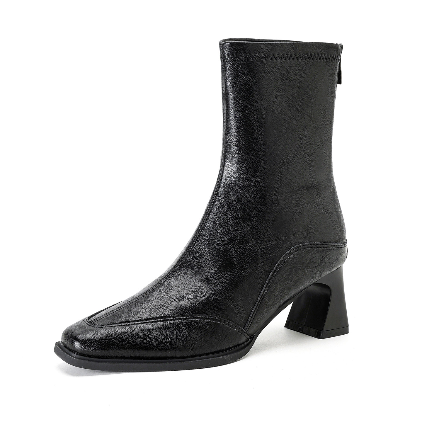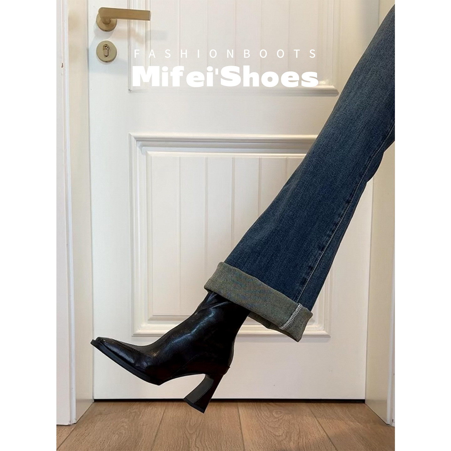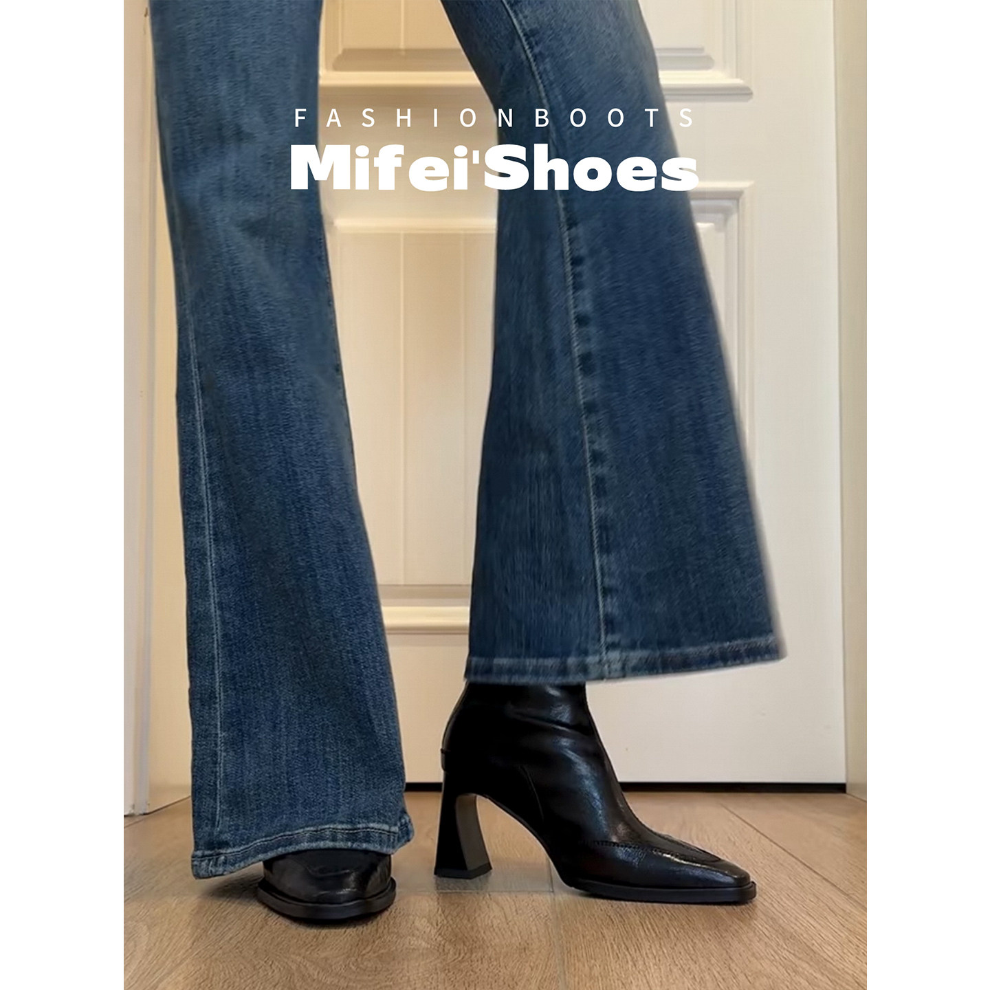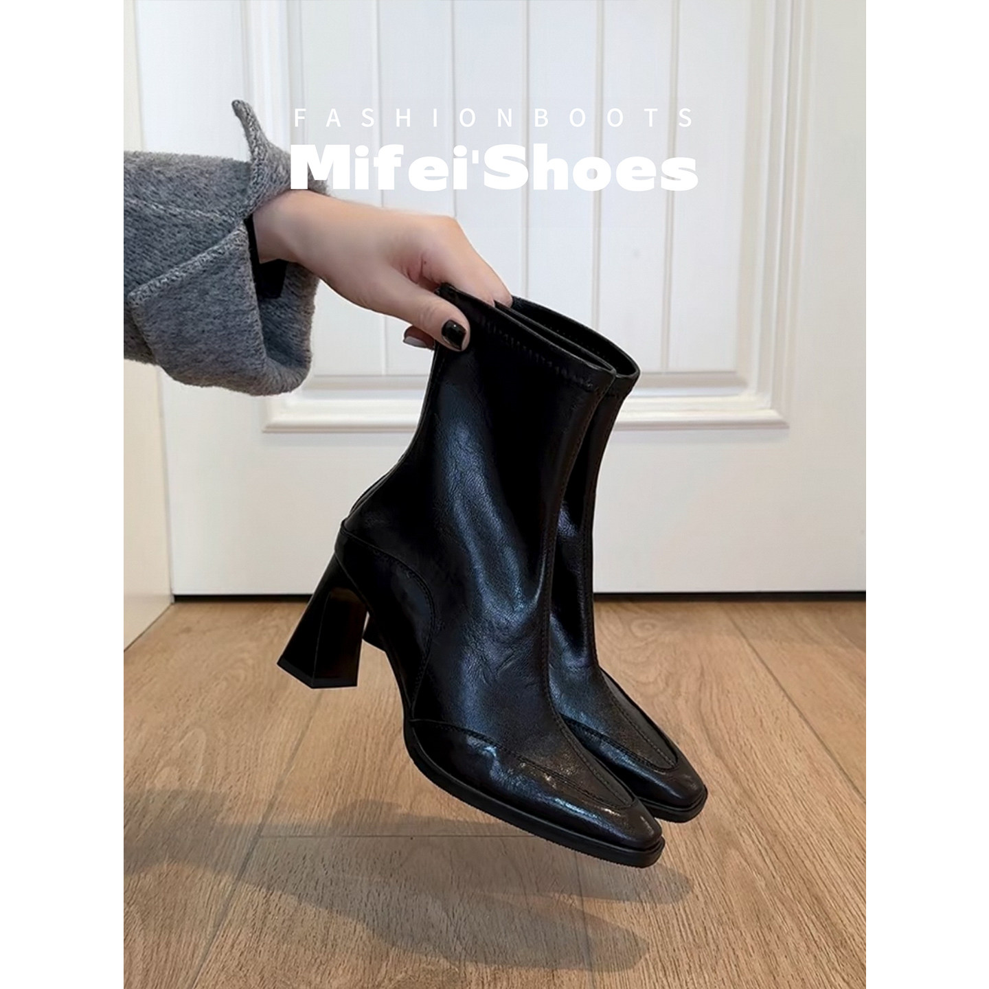 真皮~法式气质高跟短靴女秋冬季新款方头单靴粗跟瘦瘦靴大码女靴