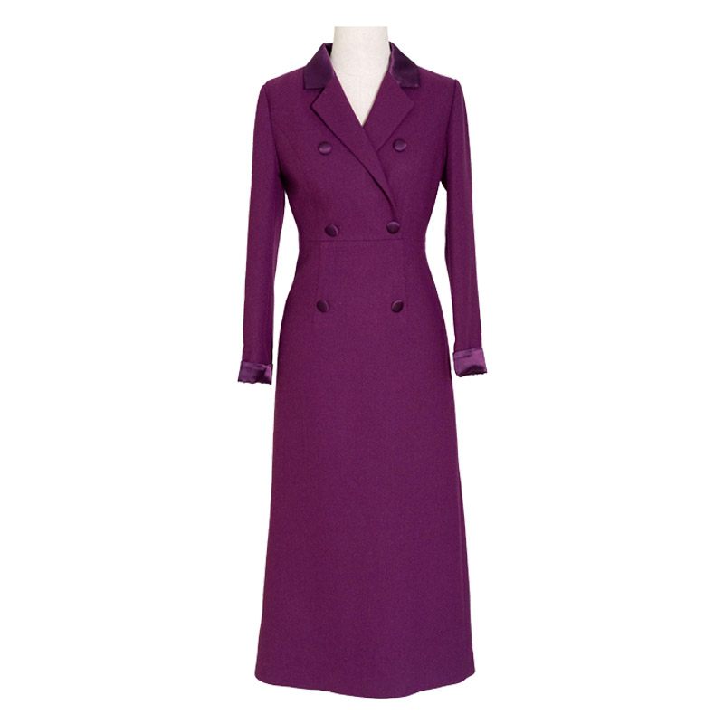紫色毛呢连衣裙女冬2025新款气质洋气修身显瘦长袖过膝开叉直筒裙