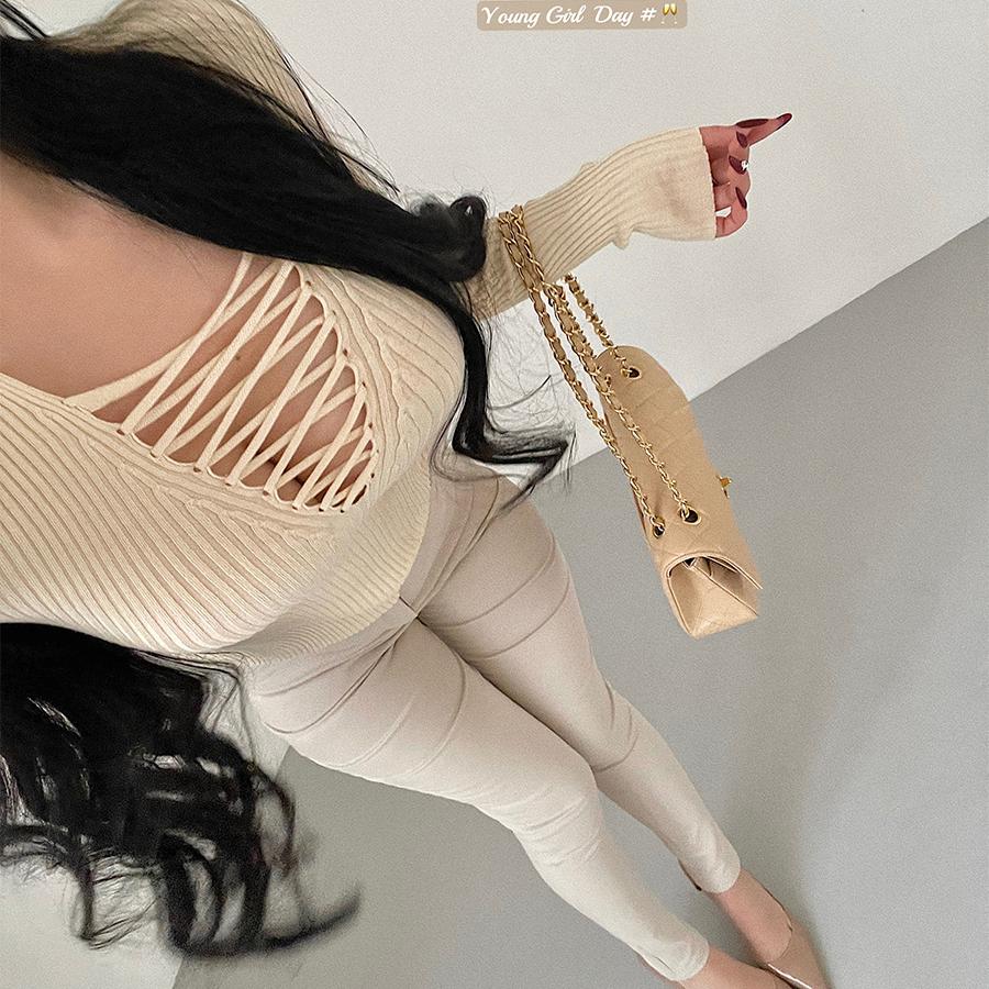 YoungGirlDay纯欲风性感胸前绑带镂空修身显瘦长袖打底针织衫上衣