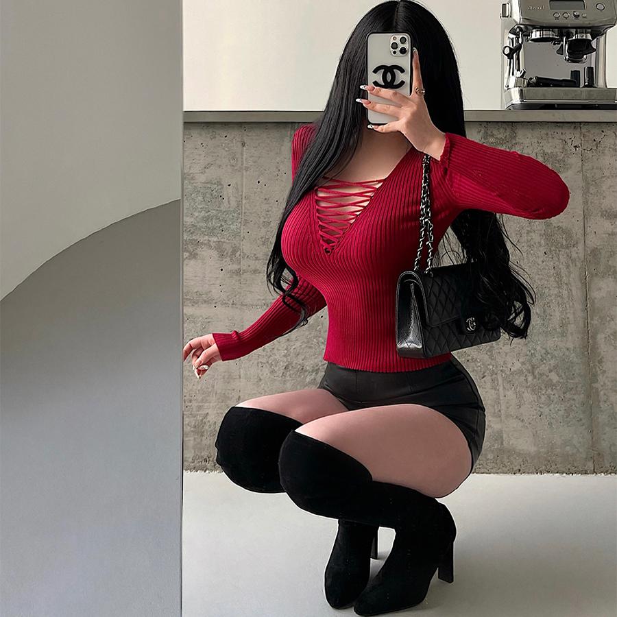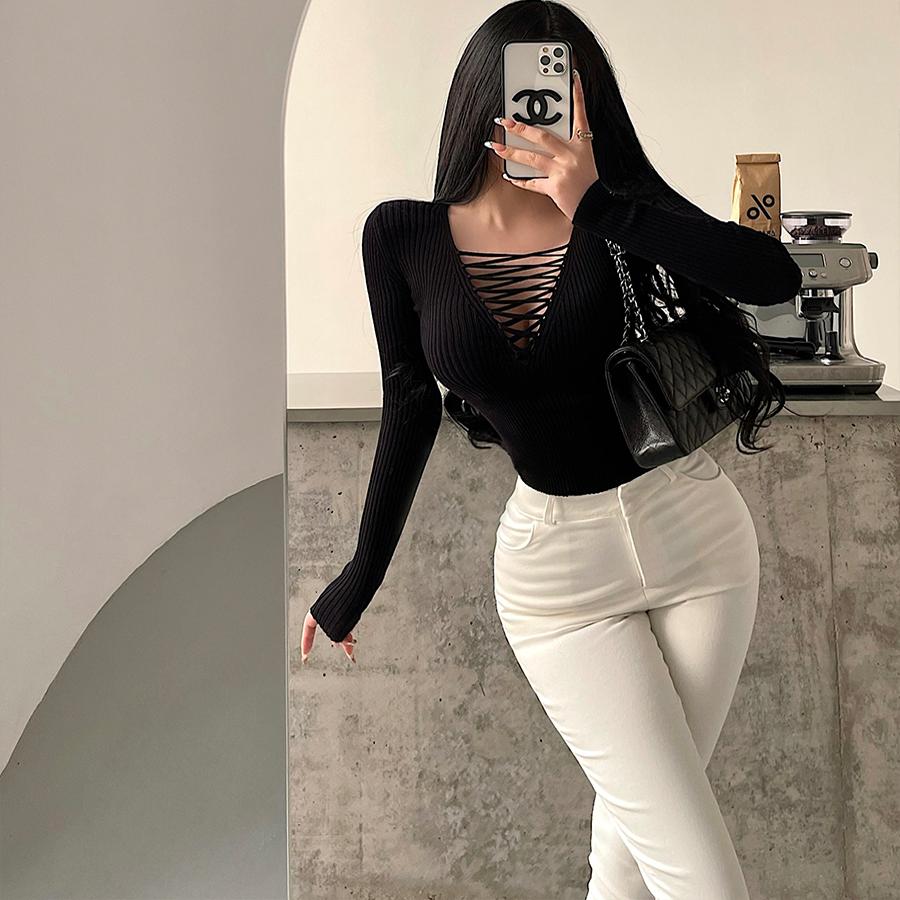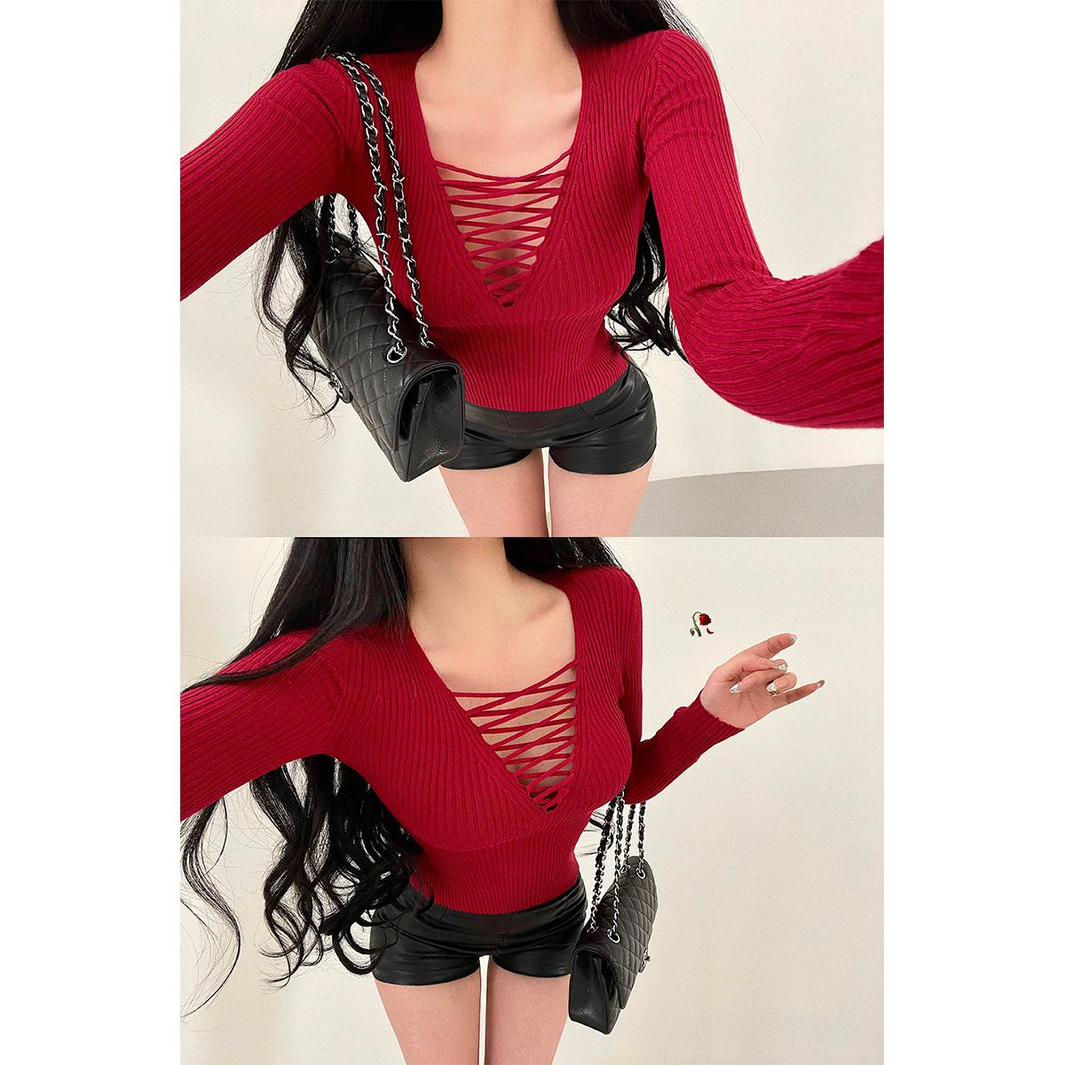 性感胸前绑带镂空长袖针织衫上衣