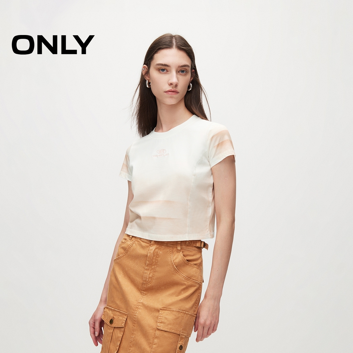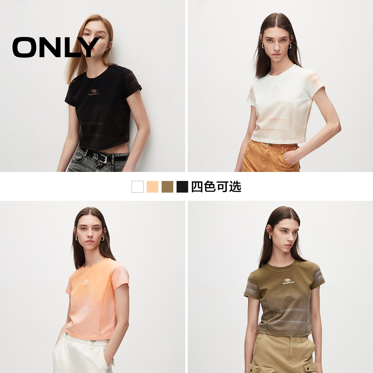 【ONLY奥莱】夏季废土风做旧水洗刺绣圆领短款T恤女