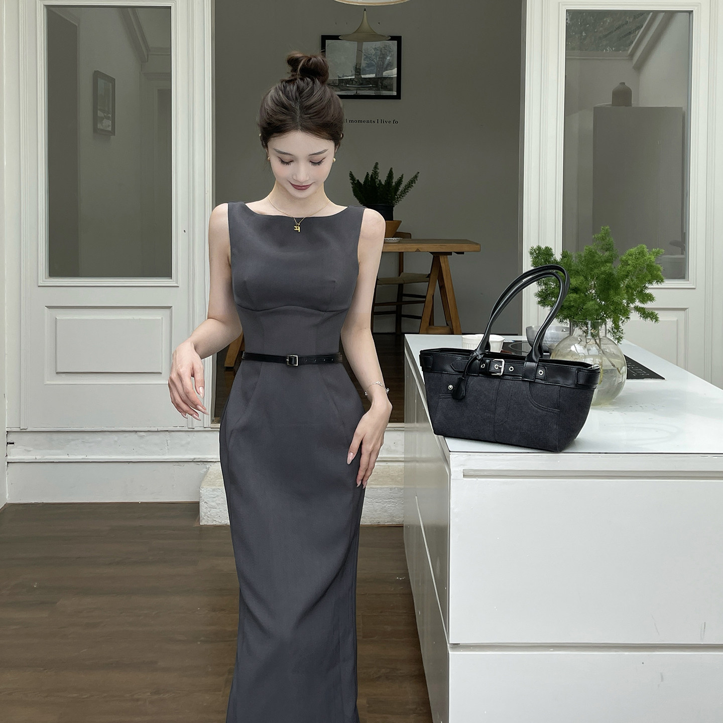 灰色无袖背心连衣裙收腰气质长裙