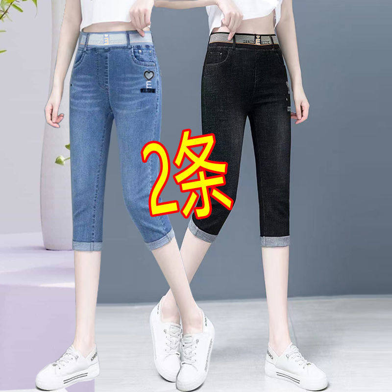 高腰牛仔七分裤女薄款弹力显瘦松紧腰牛仔中裤大码直筒短裤夏宽松