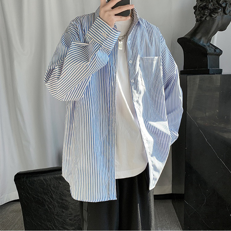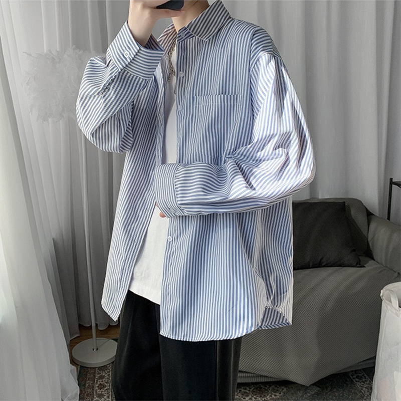 蓝白条纹长袖衬衫男2025新款春秋季休闲痞帅外套日系内搭叠穿衬衣