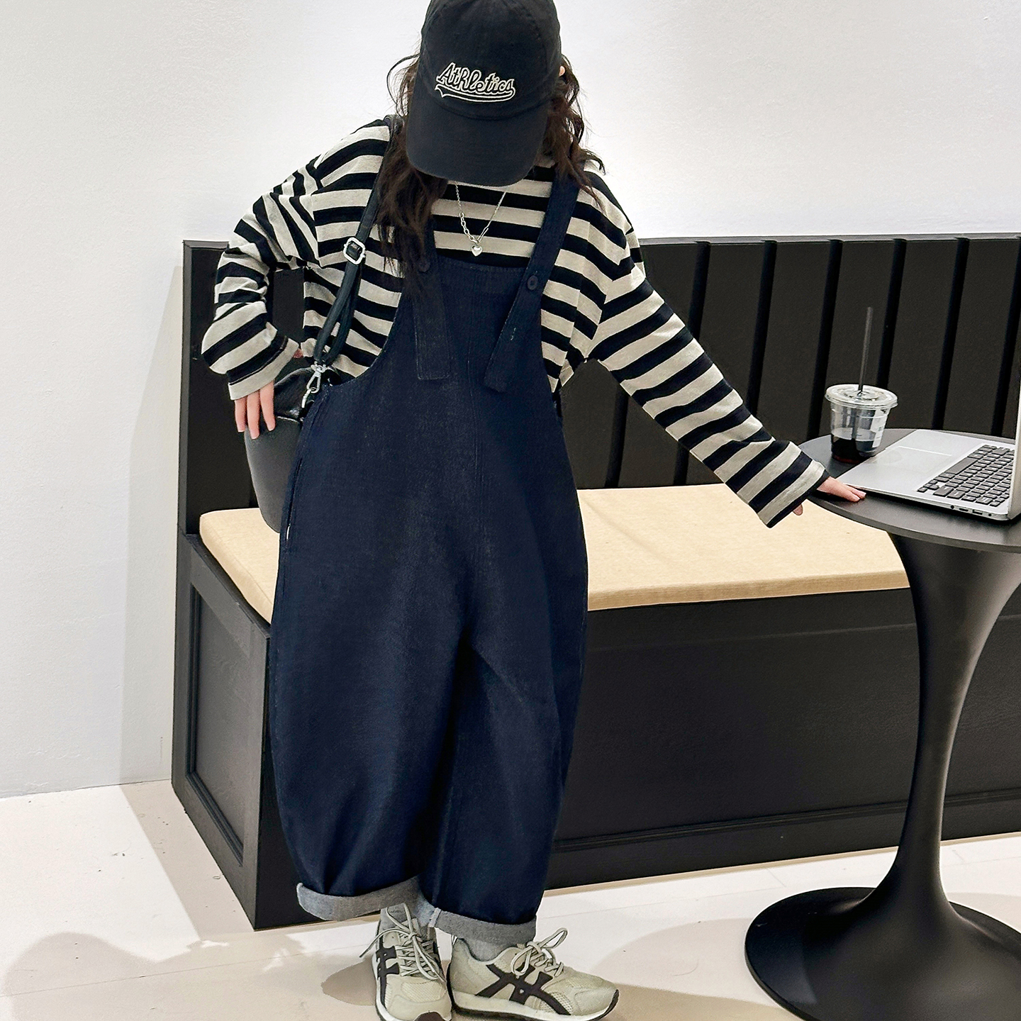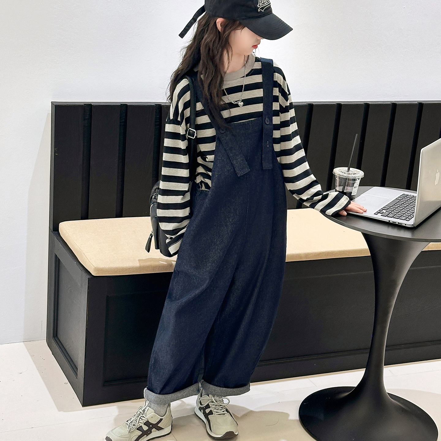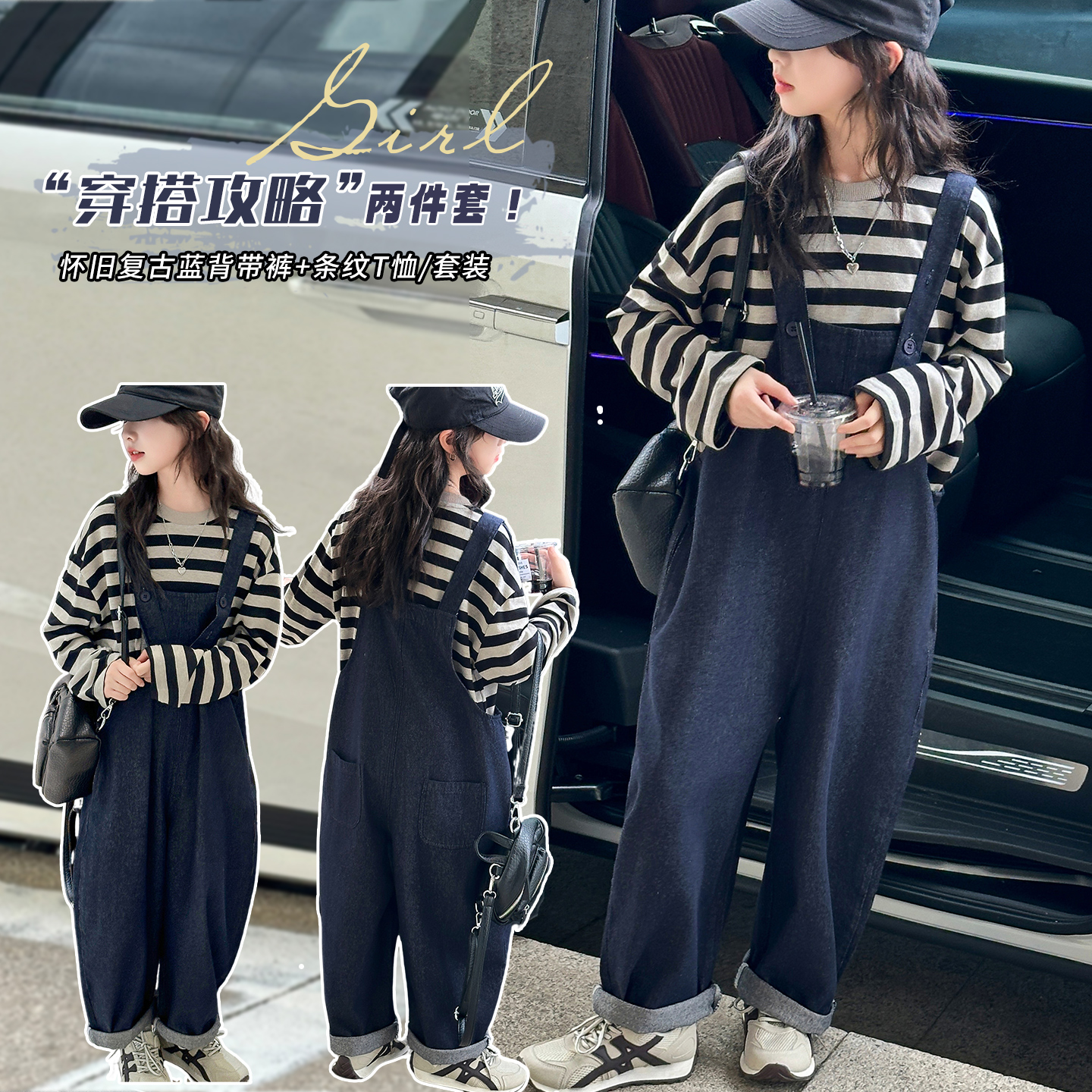 女童春秋款套装2025新款超时髦高级感条纹上衣可调节背带裤两件套