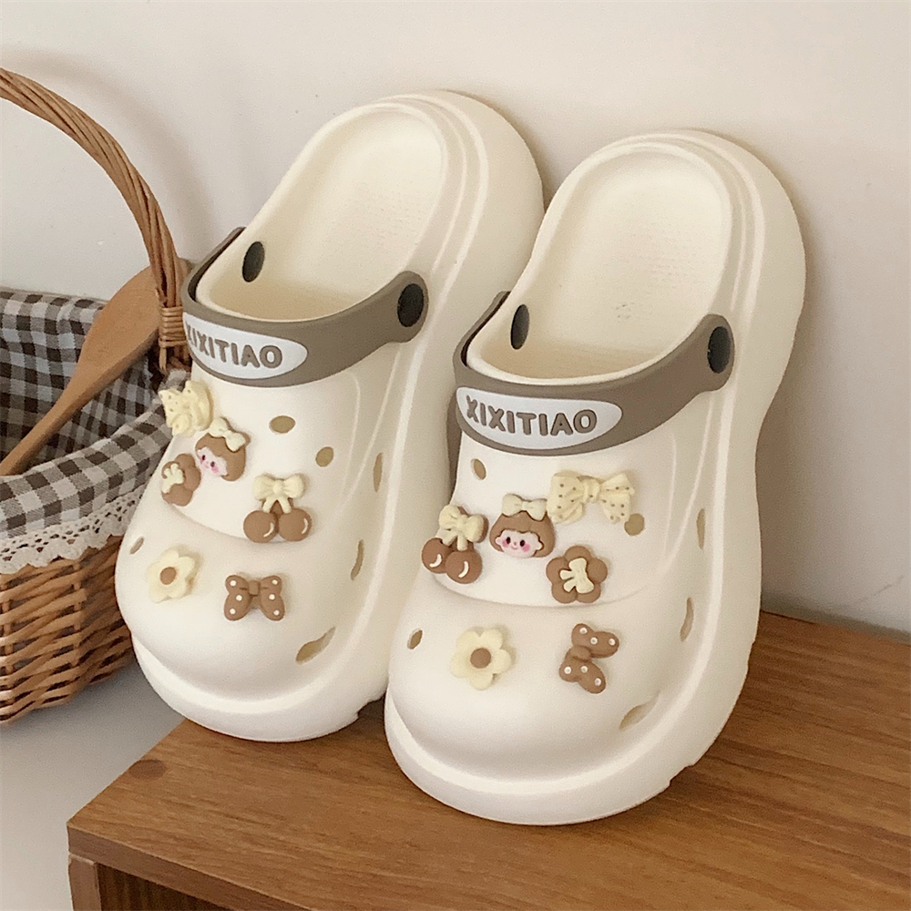 细细条 少女心沙滩洞洞鞋夏可爱蝴蝶结女孩eva软底外穿拿铁色凉鞋