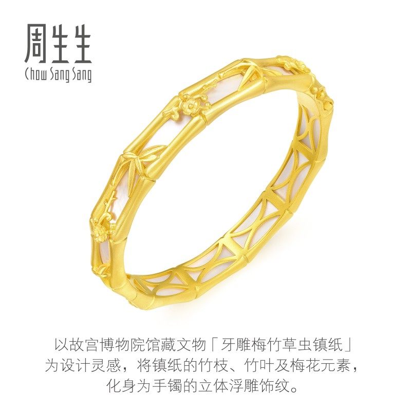 圣诞礼物周生生黄金故宫贝母宫牙雕梅竹草虫镇纸手镯92713K