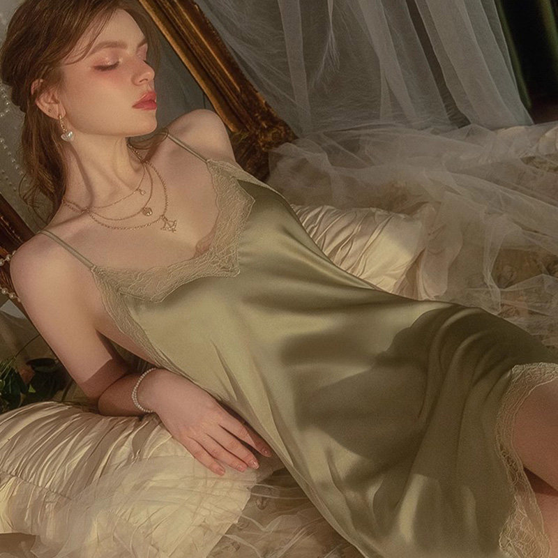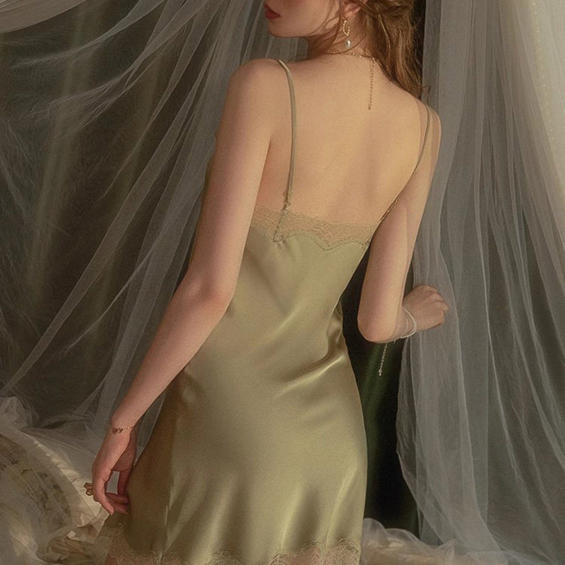 男友家性感睡衣女夏2025抹茶绿真丝纯欲风蕾丝带胸垫吊带睡裙套装